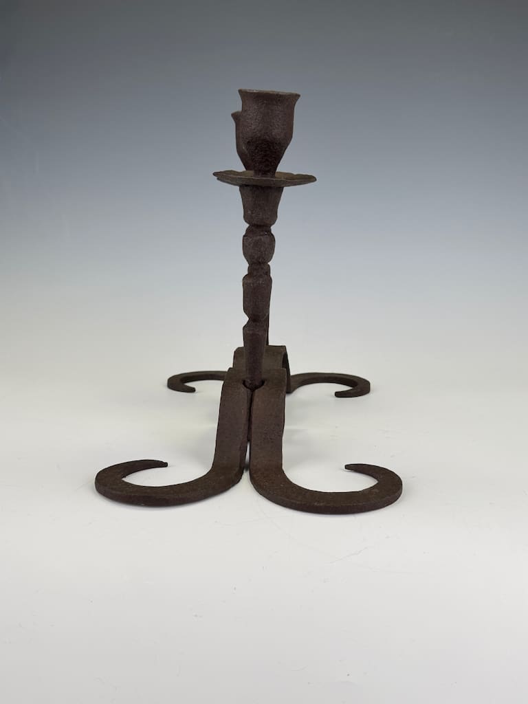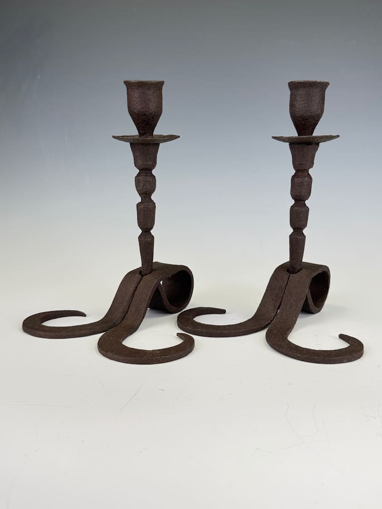 A superb and rare pair of mid to late 18th-century Flemish wrought iron candle holders, masterfully hand-forged in the traditional manner by Northern European blacksmiths. Each piece is sculpted from a single length of iron, exhibiting exceptional craftsmanship with finely twisted shafts, subtly flared bobeches, and elegant tripod bases terminating in scroll feet.