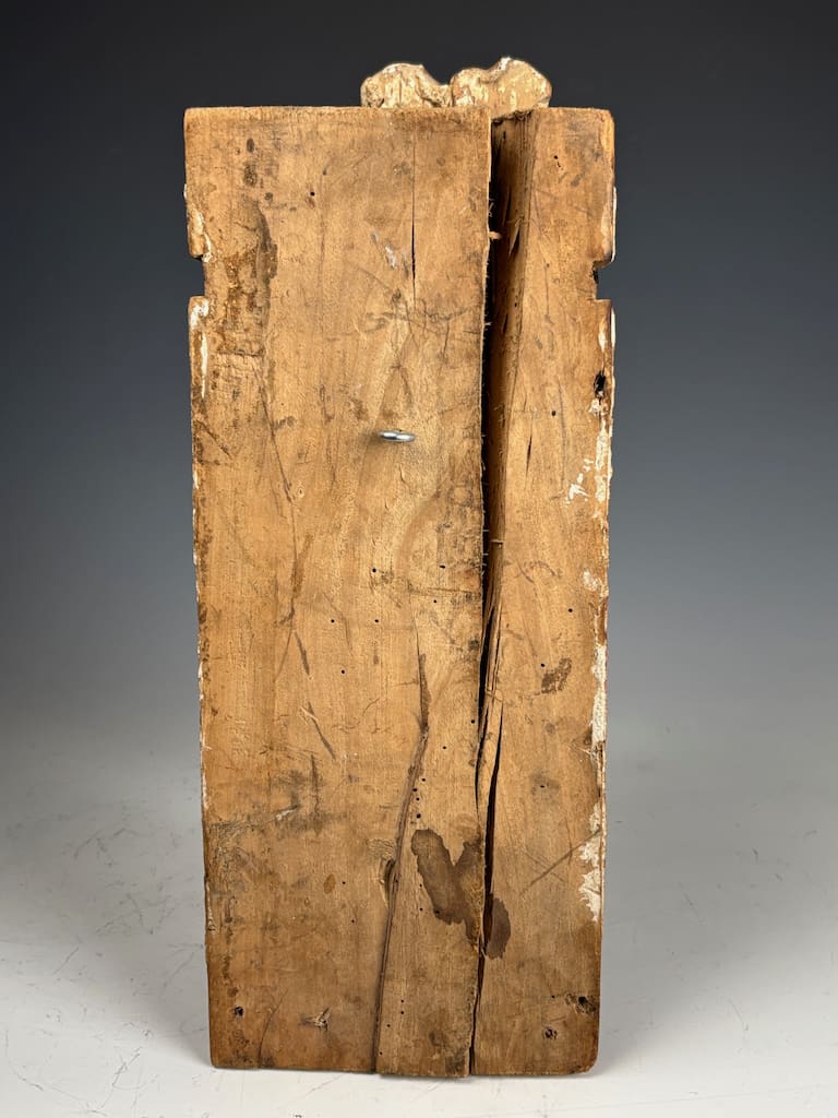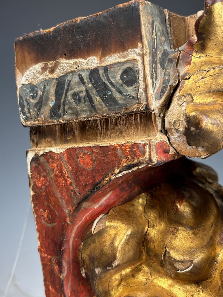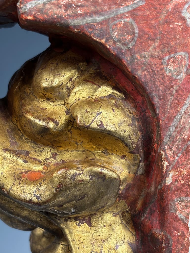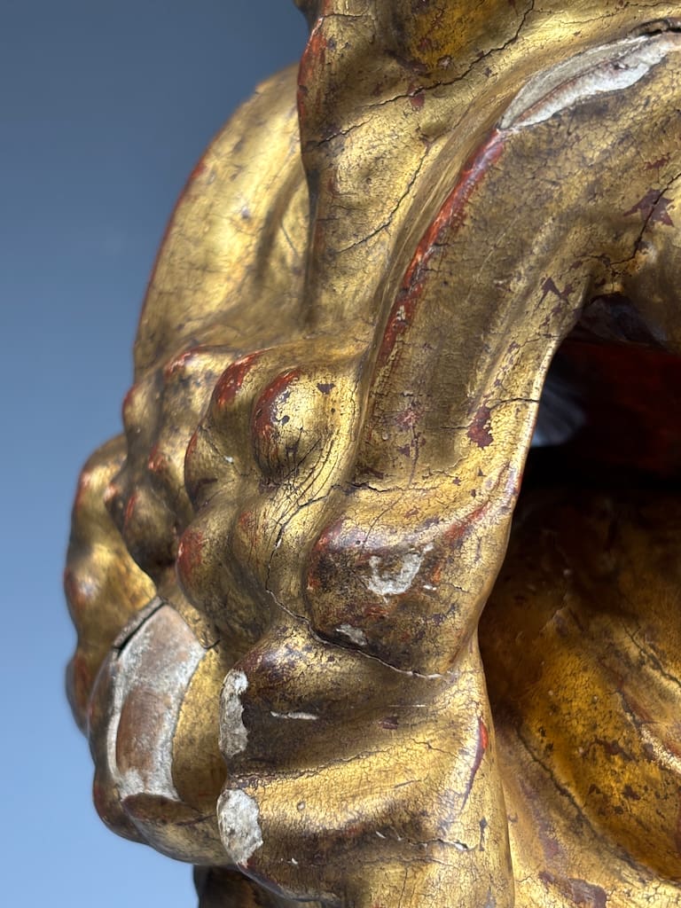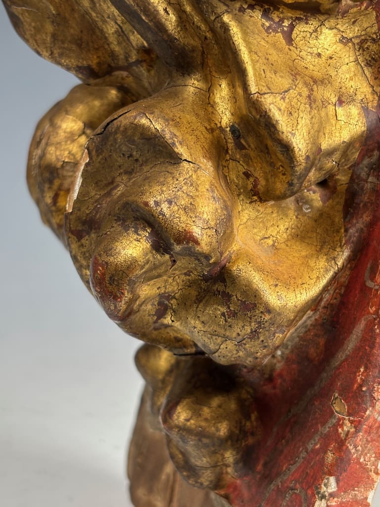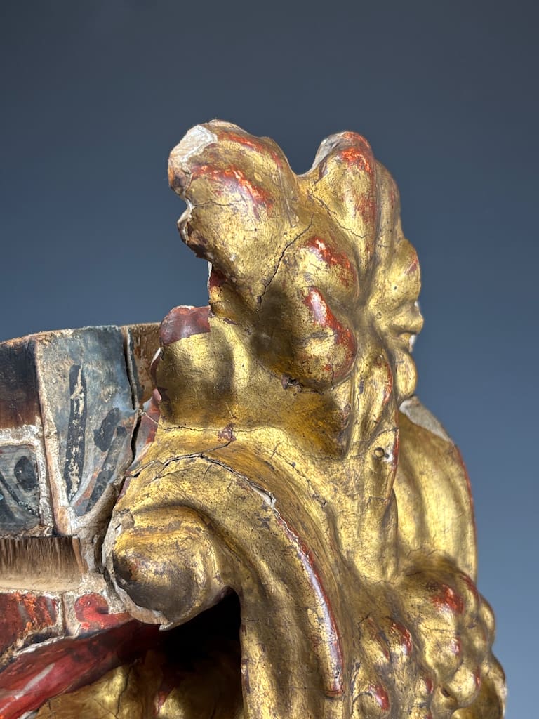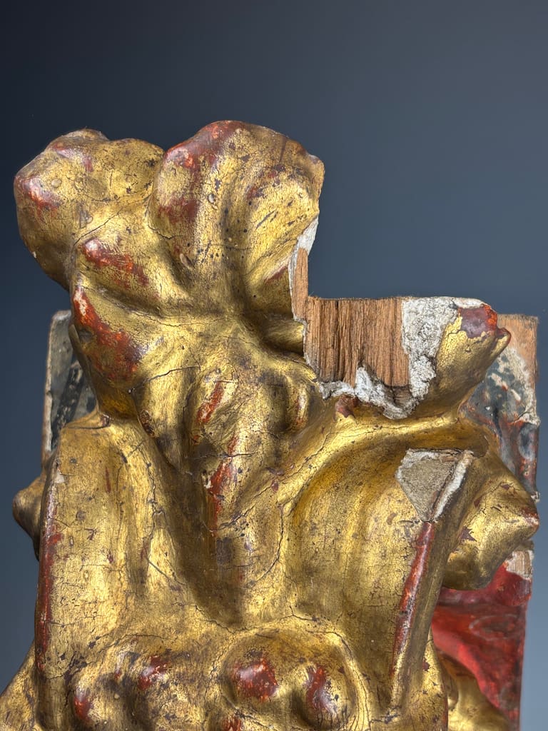 The condition is consistent with age, with areas of wear, shrinkage and old surface losses, all contributing to its historic character and authenticity. The surviving layers of gilt and polychromy lend great depth and richness, while the fragmentary nature only enhances its sculptural presence as an objet de vertu today.