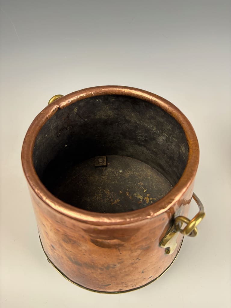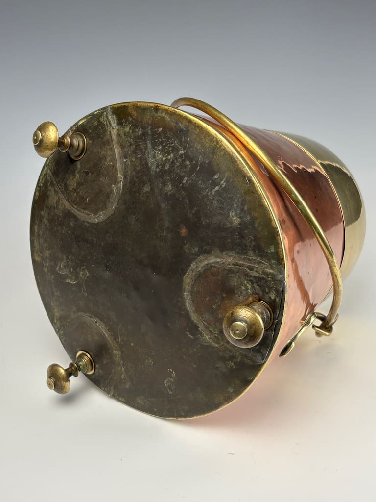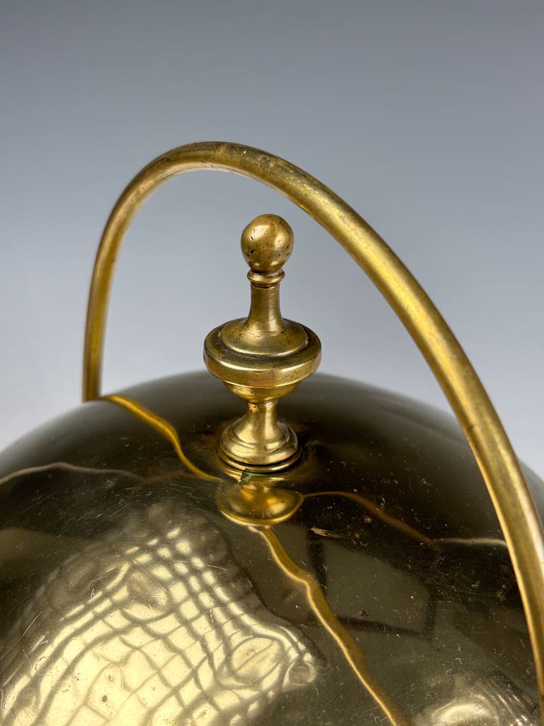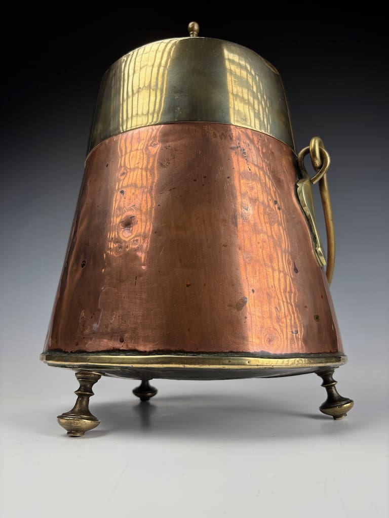 The lid is a perfect example of purpose-driven design: a heavy, seamless brass dome topped with a turned finial. When placed firmly on the rim, it would have created an airtight seal, starving the embers of oxygen and extinguishing them safely. The sturdy, riveted ring handles and three small brass feet complete the form, lending it both stability and a refined decorative air.