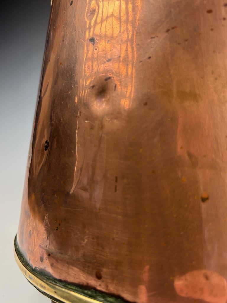 The doofpot is a striking study in contrasting materials and functional design. Its robust, tapering body is expertly fashioned from hand-beaten copper, a material chosen for its excellent heat-resistant properties. The copper's surface has developed a magnificent, warm patination over time, speaking to its authentic and storied history. This rich, earthy tone is beautifully complemented by the polished brass of the lid, handles, and feet, which have been polished to a brilliant shine.