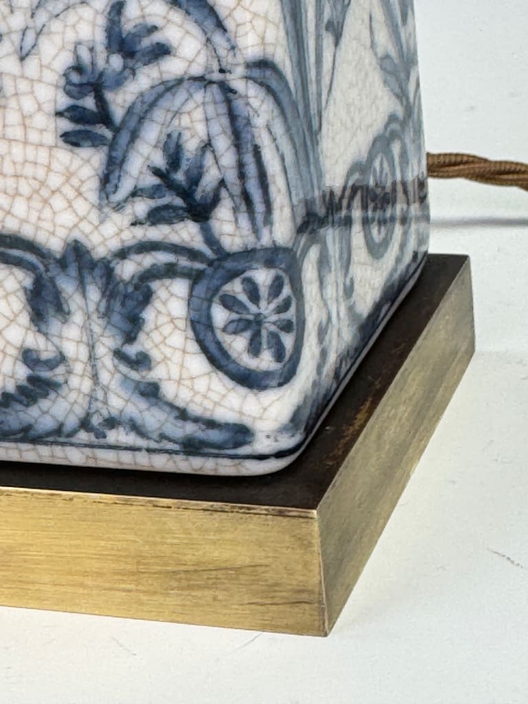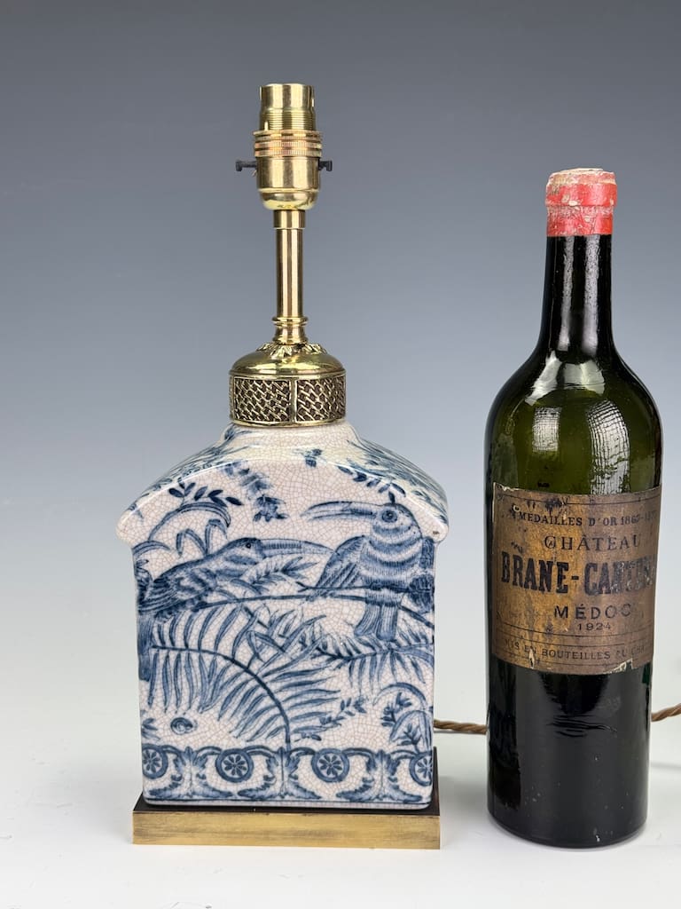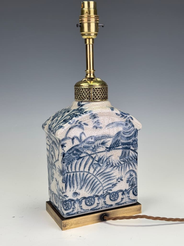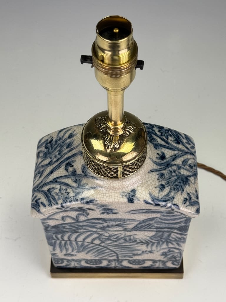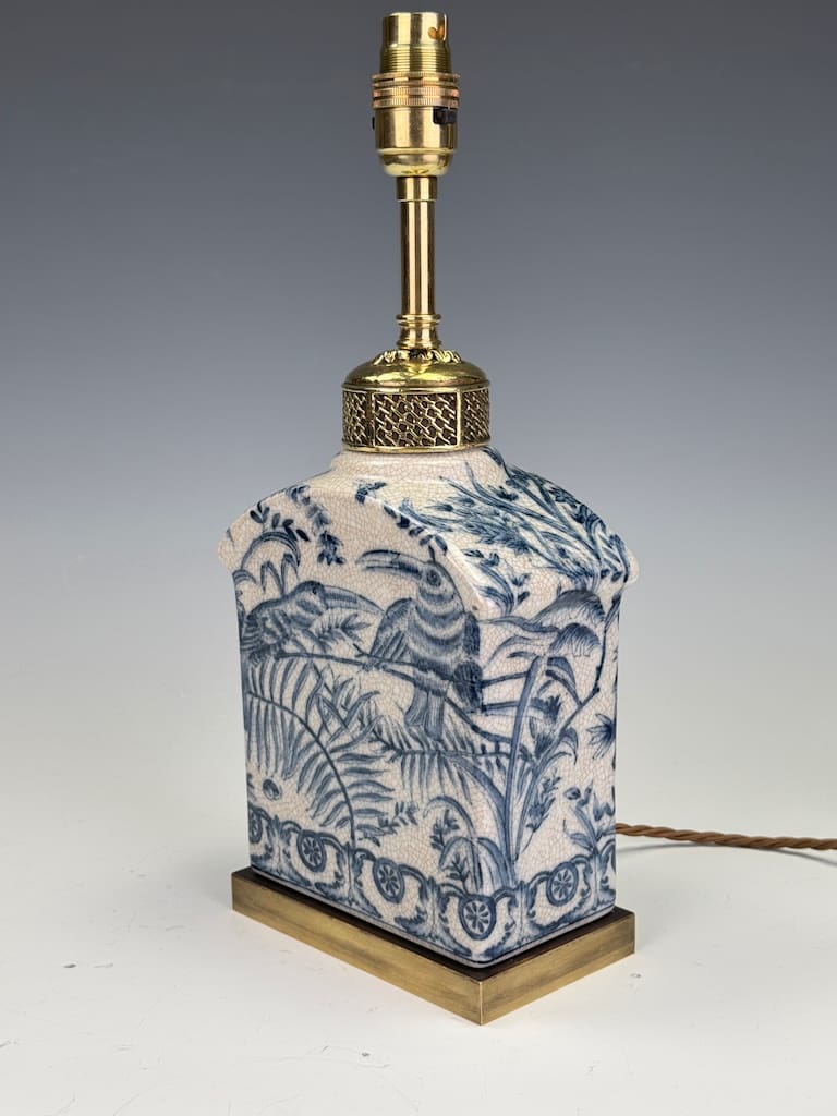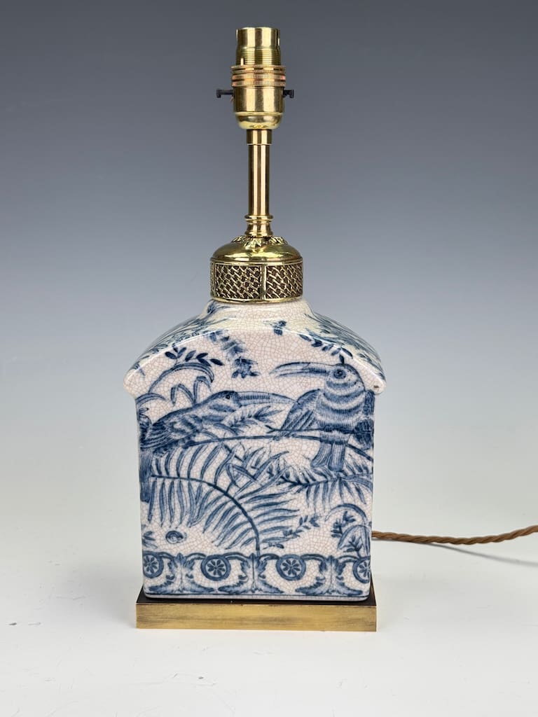 The lamp base is crafted from a fine earthenware with a delicate, finely crazed glaze that adds a wonderful antique patina. The intricate hand-painted decoration in cobalt blue depicts a series of exotic birds, possibly mythical or stylised pheasants, amidst a dense and lush landscape of ferns, bamboo, and stylised flora. A captivating feature is the circular sun-like motif with radiating lines, a strong nod to Japanese influence, particularly the rising sun of the Meiji period. Below this central scene, a decorative border of interlocking scrolls and stylised medallions completes the composition.
