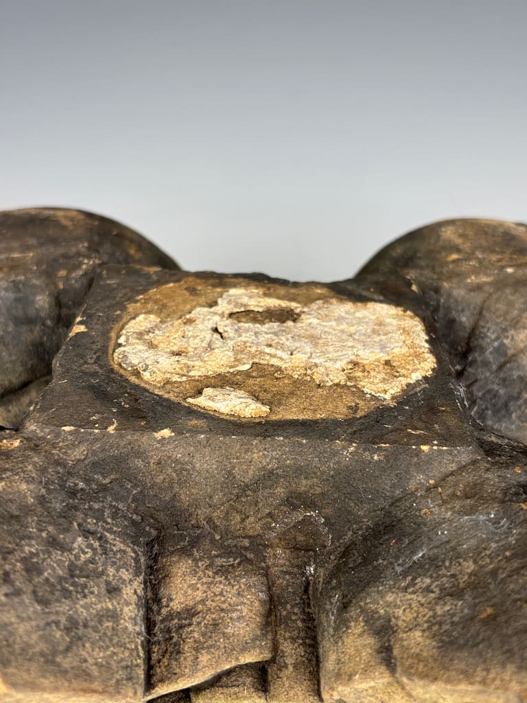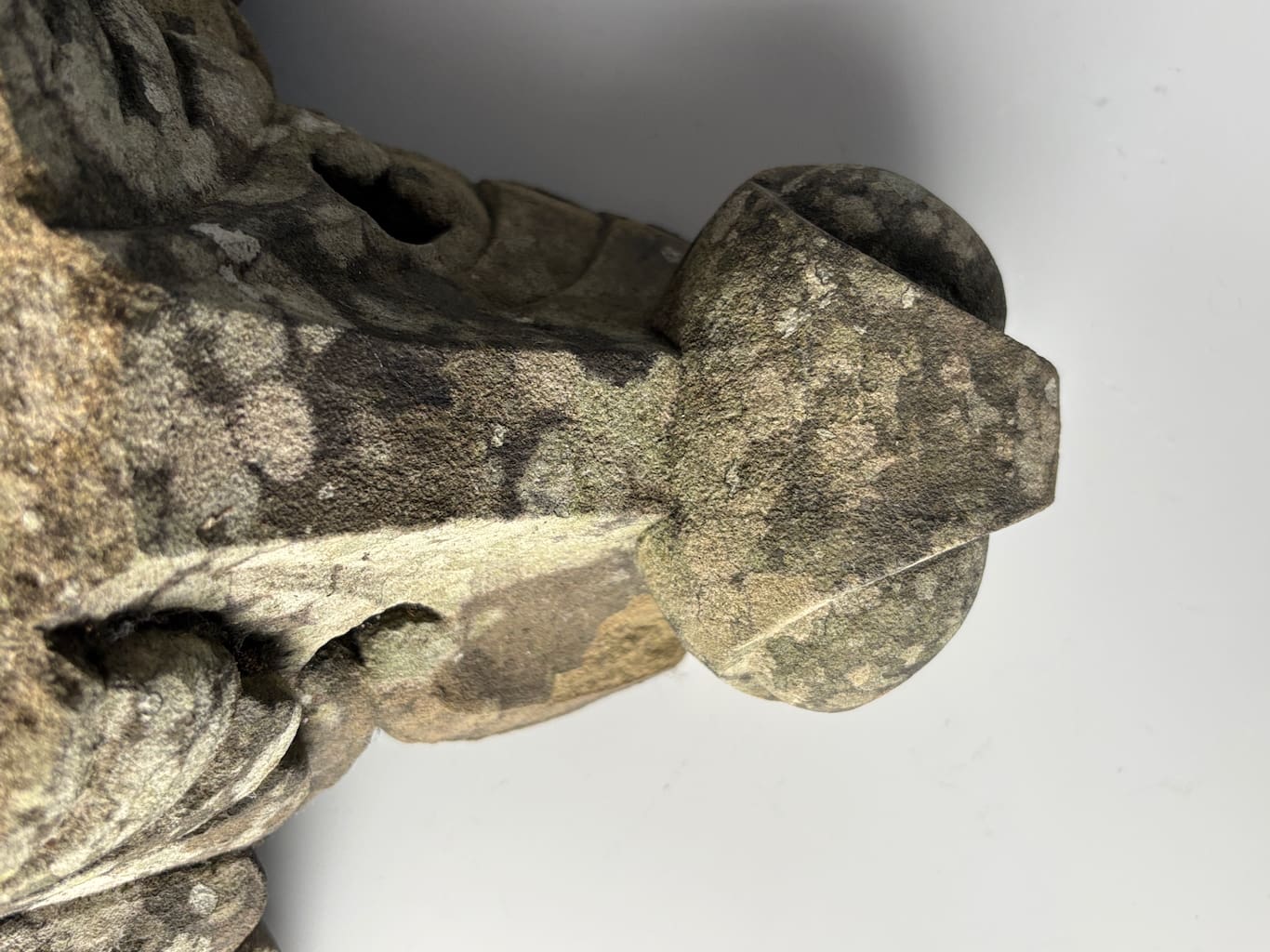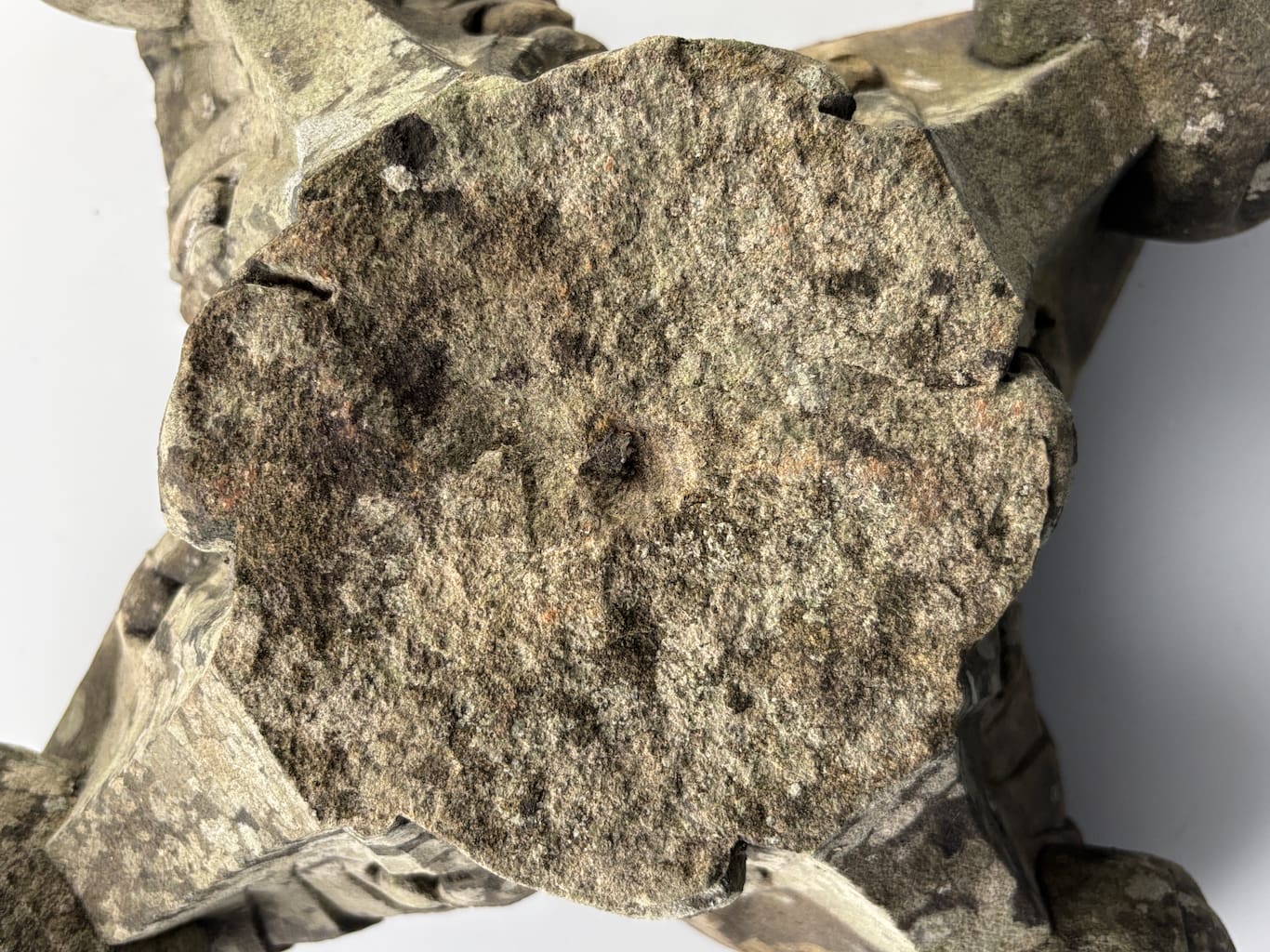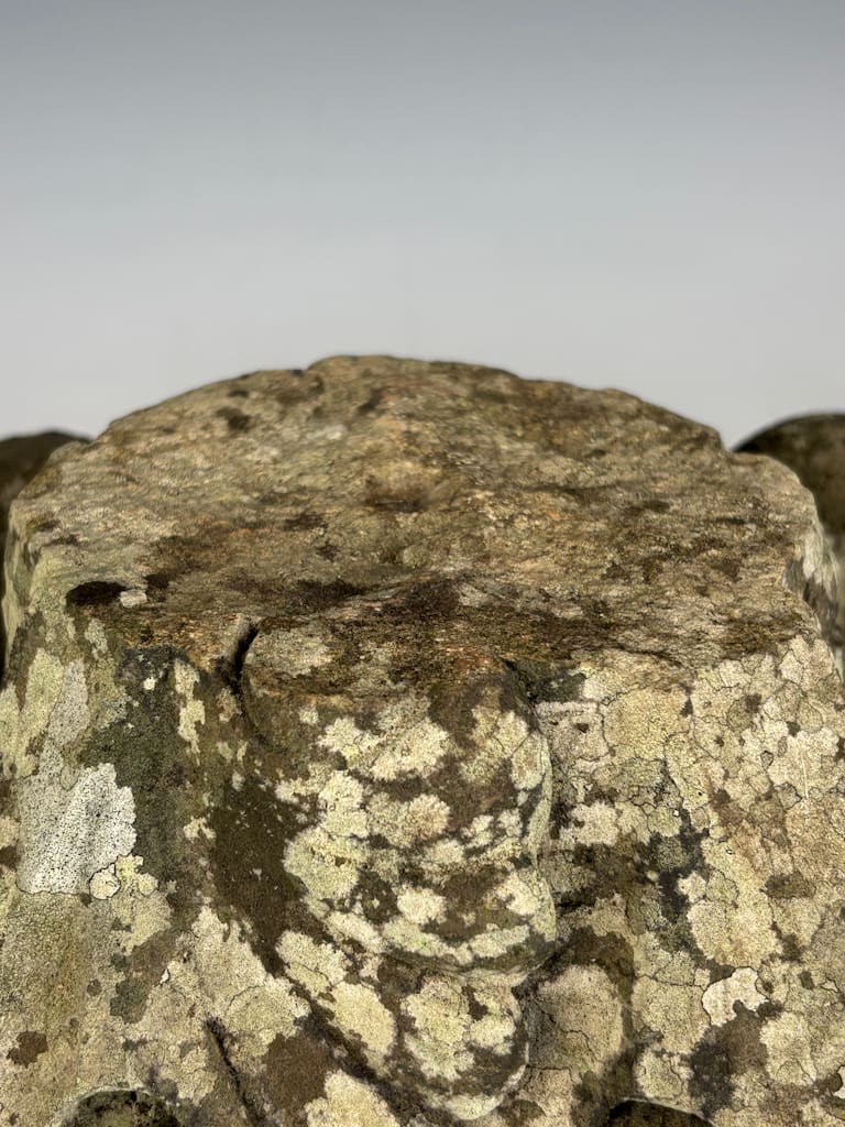 The item is offered in its found, "as-is" condition, consistent with over a century of outdoor exposure. The surface of the carved stone has developed a magnificent, natural patination, a highly desirable characteristic for a piece of this age. The stone is covered in a rich tapestry of mosses and lichens, presenting a beautiful variety of green, gray, and ochre tones. This natural growth confirms its authenticity and longevity as a garden ornament.