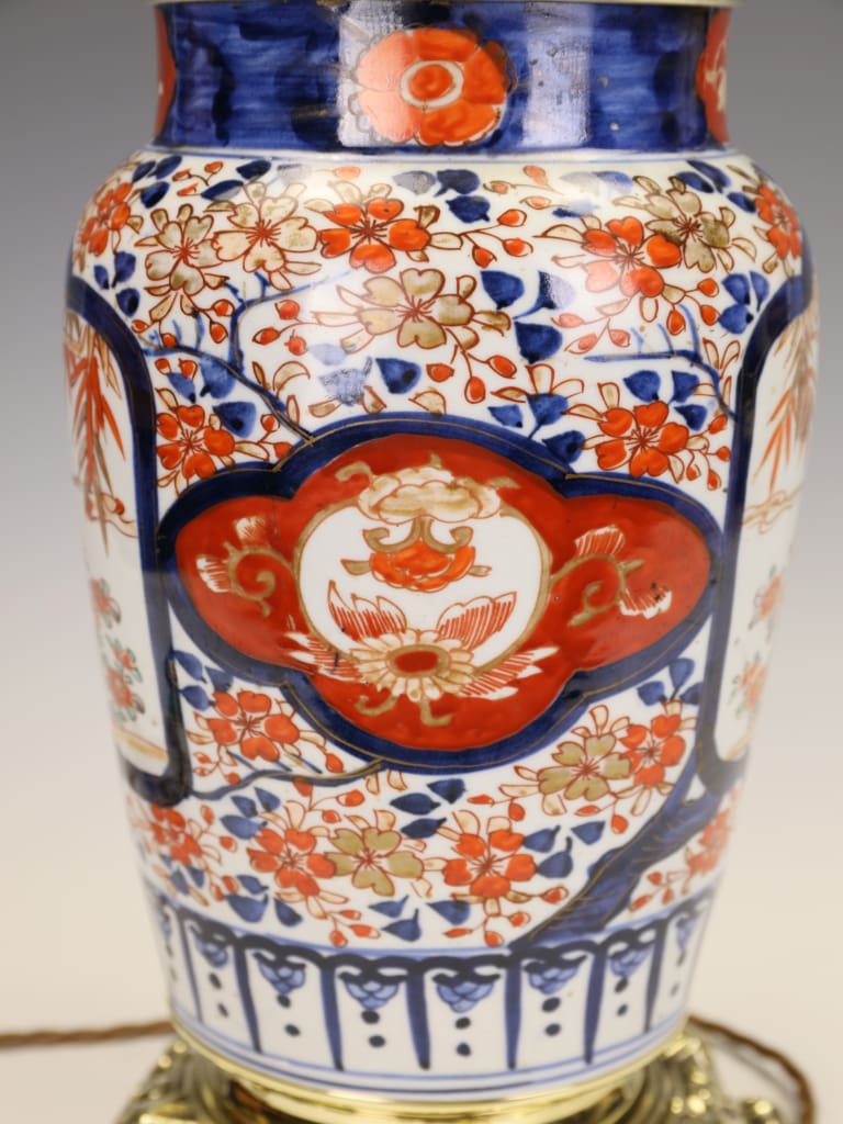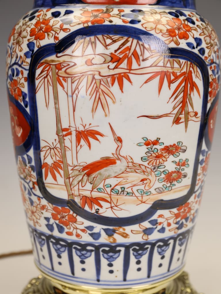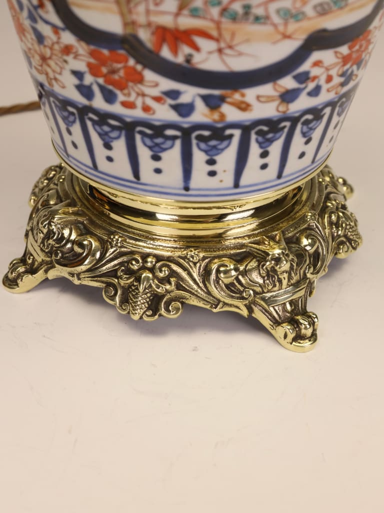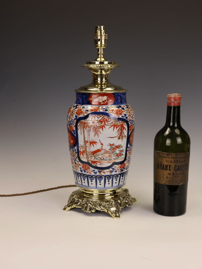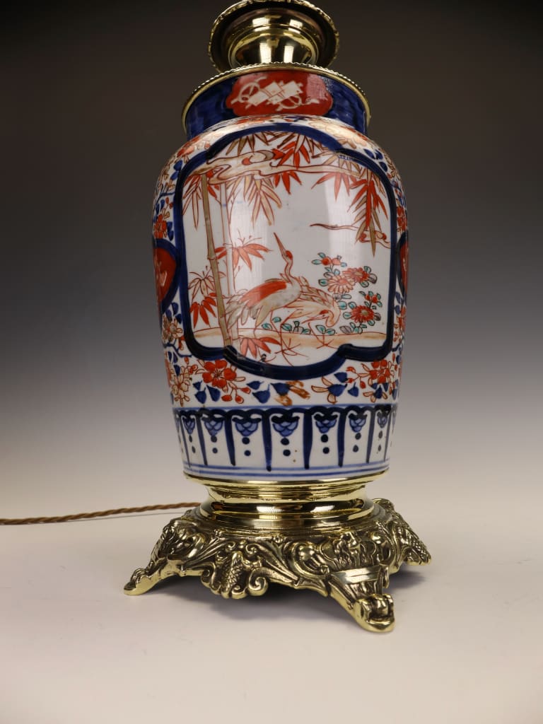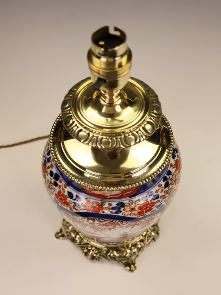 Small-scale Imari wares like this were highly prized in the late 19th century as part of the 'Aesthetic Movement' in Britain. Unlike the massive vases intended for grand hallways, these smaller lamps were designed for the more private, intimate spaces of a Victorian home. The 'Imari' palette of red, blue, and gold has remained a staple of British interior design for over a century, famed for its ability to complement both warm wood tones and rich fabrics.
