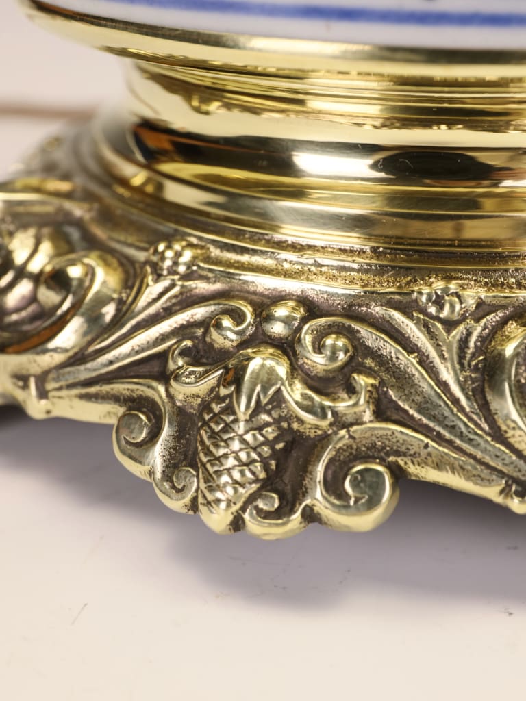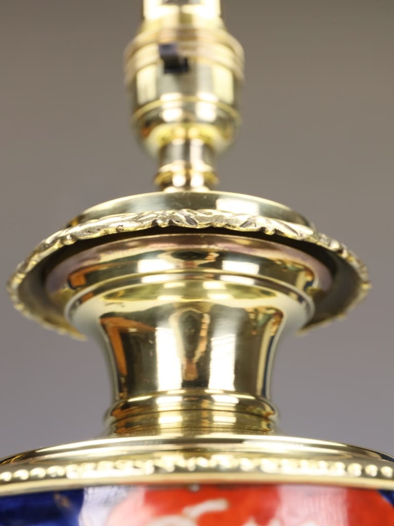 Professionally restored and rewired to modern UK standards using high-quality British-made components. It features a new brass B22 bayonet bulb holder and a gold-braided silk three-core flex that perfectly matches the gilding of the porcelain.