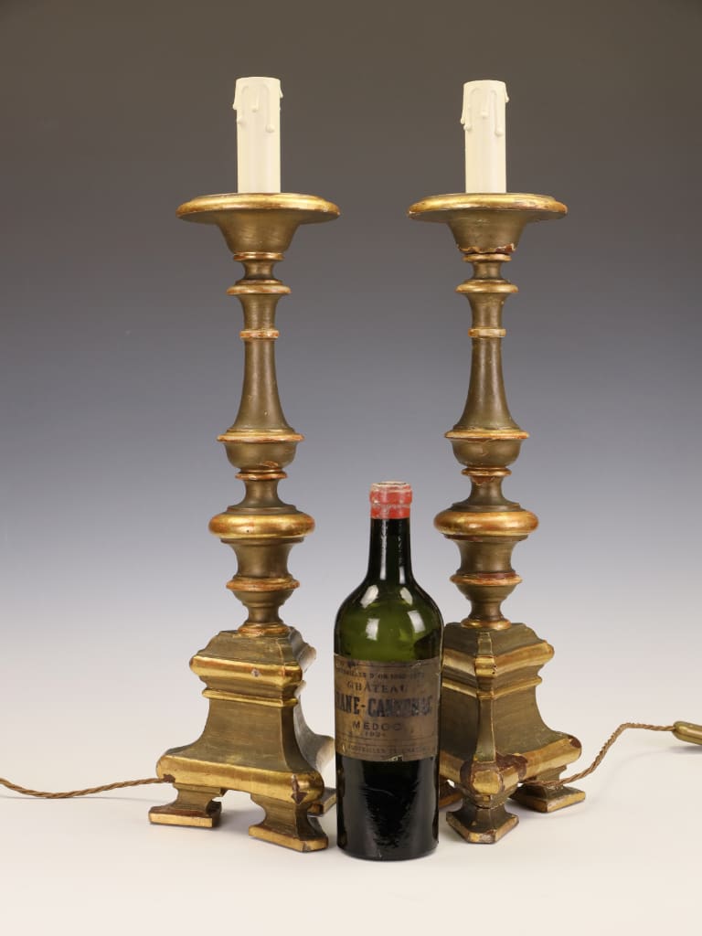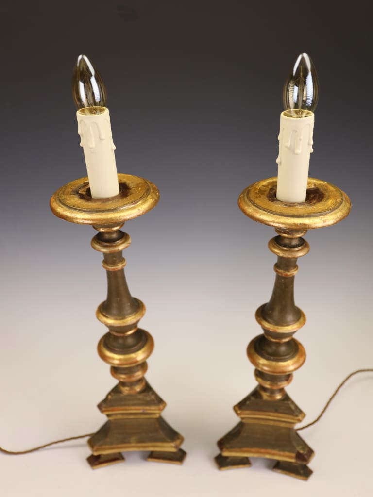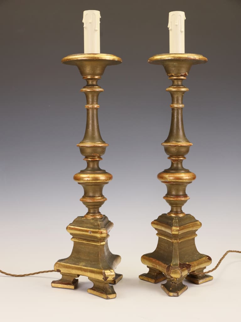 A truly grand pair of Continental giltwood and polychrome table lamps, originally conceived as ecclesiastical pricket candlesticks. These impressive pieces are carved in the Baroque manner, featuring a tiered, knapped stem with elegant baluster turnings that lead down to a substantial, splayed tripartite base. The surface retains a wonderful "weathered" patina, where the original soft-olive green polychrome paint peeks through the distressed water-gilding, creating a depth of texture that only centuries of age can bestow.