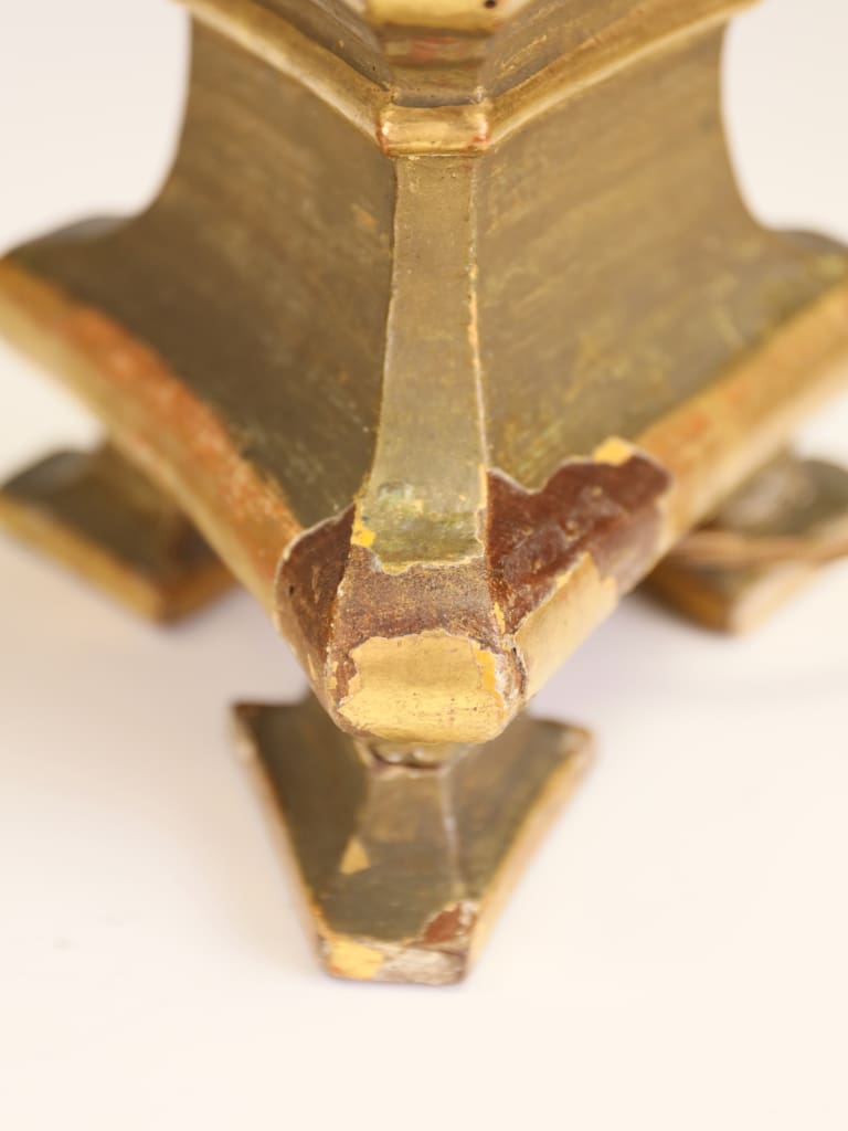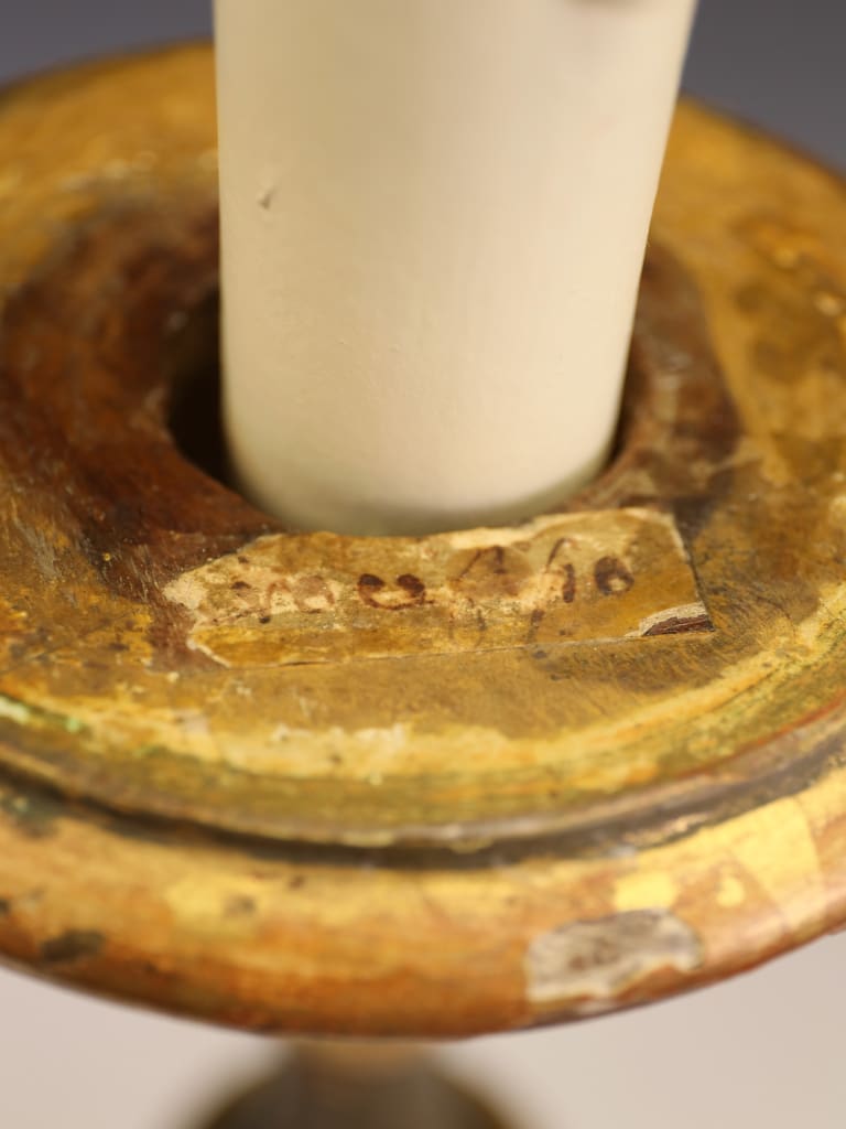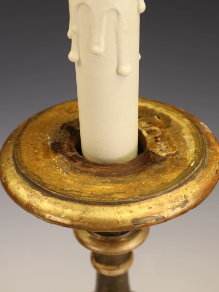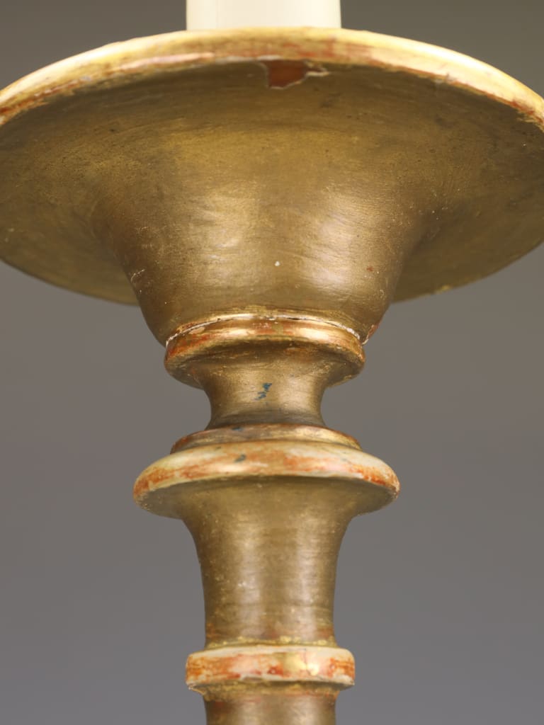 Pricket candlesticks of this form were a staple of 18th and 19th-century Italian and French ecclesiastical design. Carved from lime or pine wood, they were gilded to catch the flickering candlelight of the cathedral, creating a sense of divine opulence. In the mid-20th century, many of these grand pieces were brought into private collections and converted to electricity, becoming a hallmark of the 'Chic Antique' style championed by designers such as John Fowler.