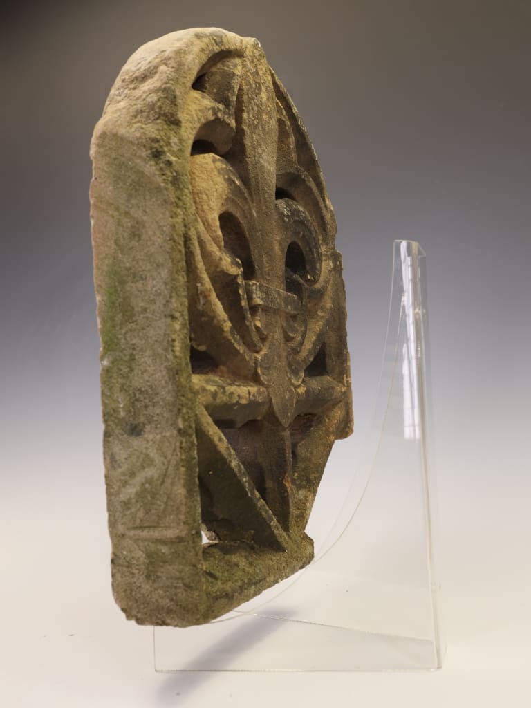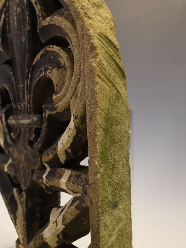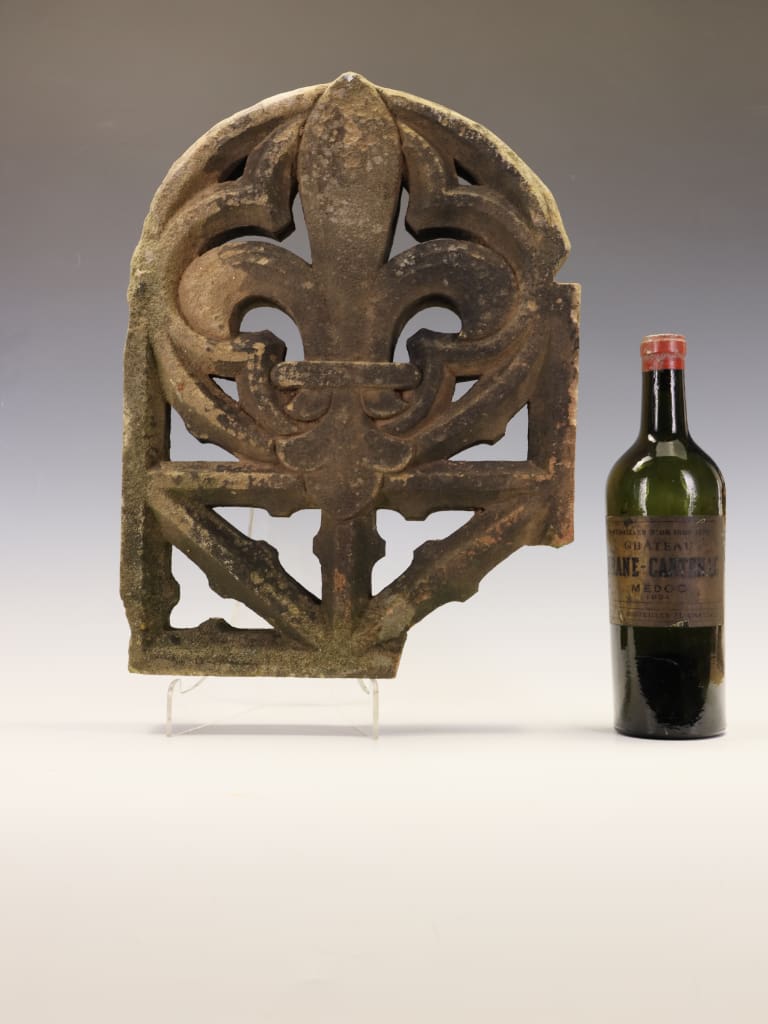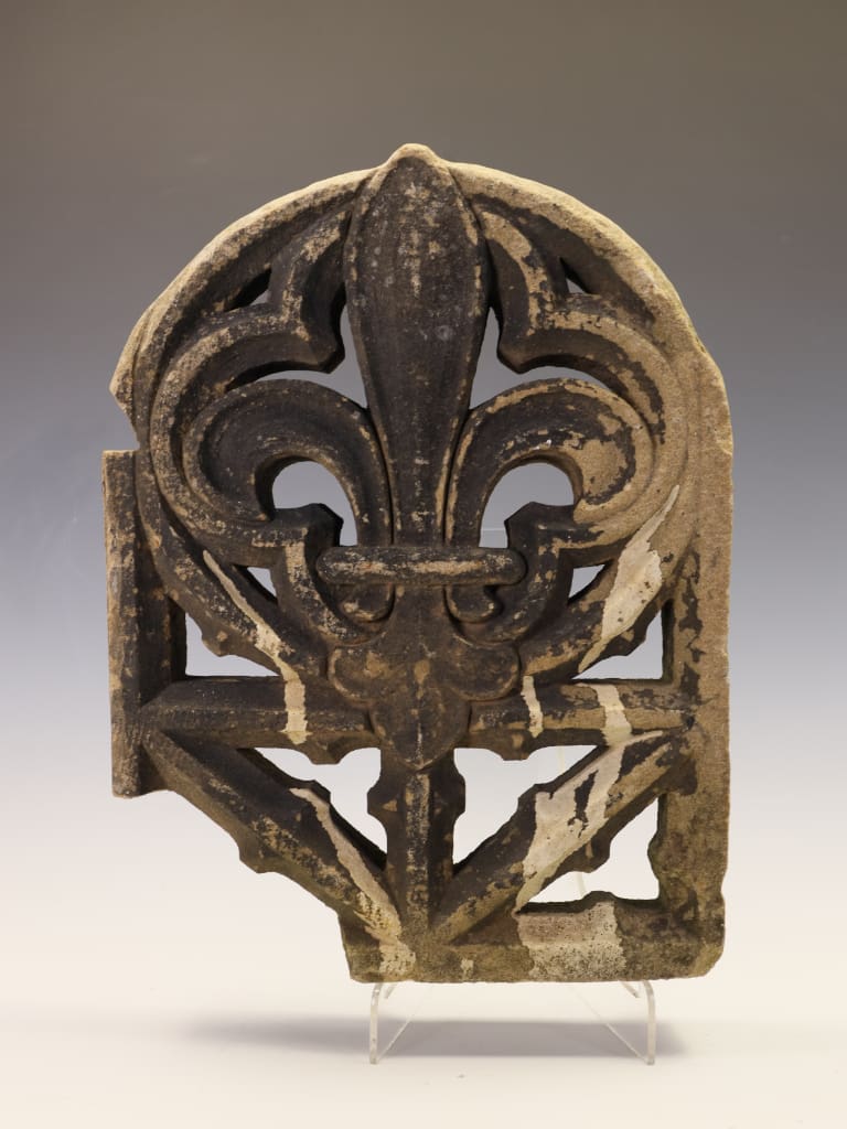 A magnificent and deeply evocative piece of architectural salvage, this Gothic Revival stone fragment is a testament to the enduring beauty and rich symbolism of medieval design. Carved with exceptional skill from a dense, warm-toned sandstone, this piece features the powerful and instantly recognizable Fleur-de-Lis motif at its center.