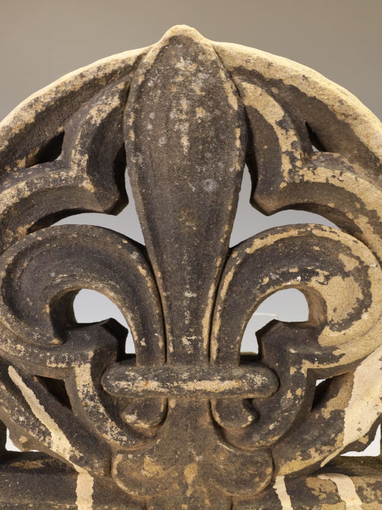 The central Fleur-de-Lis is beautifully sculpted, its stylized petals rising to a sharp point, surrounded by an open framework of flowing, vegetal-inspired curves. The carving is bold and deep, creating a wonderful interplay of light and shadow that highlights the motif’s structural elegance.