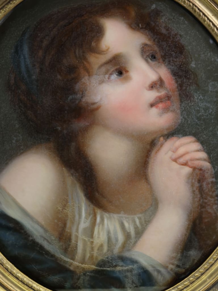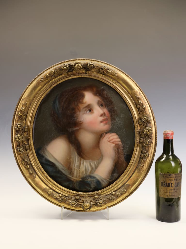 The subject is presented in a classic oval form, her gaze directed upwards in a manner reminiscent of the Romantic movement's "devotional" portraits. The painting is housed within its original oval carved frame, which features intricate foliate and floral motifs in relief. The frame's gilding has aged to a soft, antique lustre, perfectly complementing the ethereal quality of the portrait.