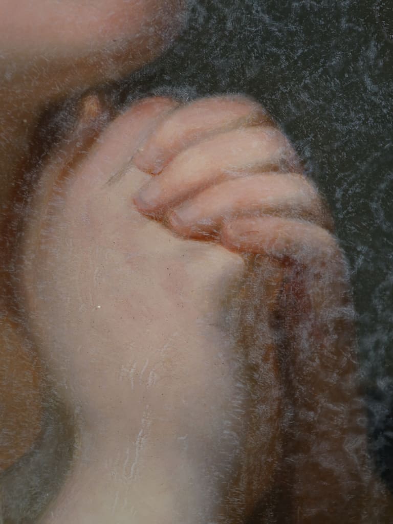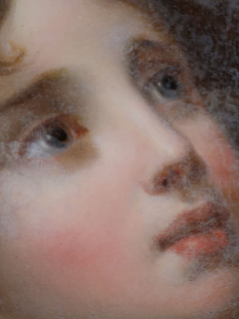 Mid-19th-century English portraiture often sought to capture the "inner life" of the sitter, moving away from the formal rigidity of earlier Georgian styles toward a more emotive, Romantic sensibility. The technique of laying canvas onto glass was a refined practice used to protect the delicate paint layers while providing a smooth, glass-like finish that mimicked the preciousness of a miniature.