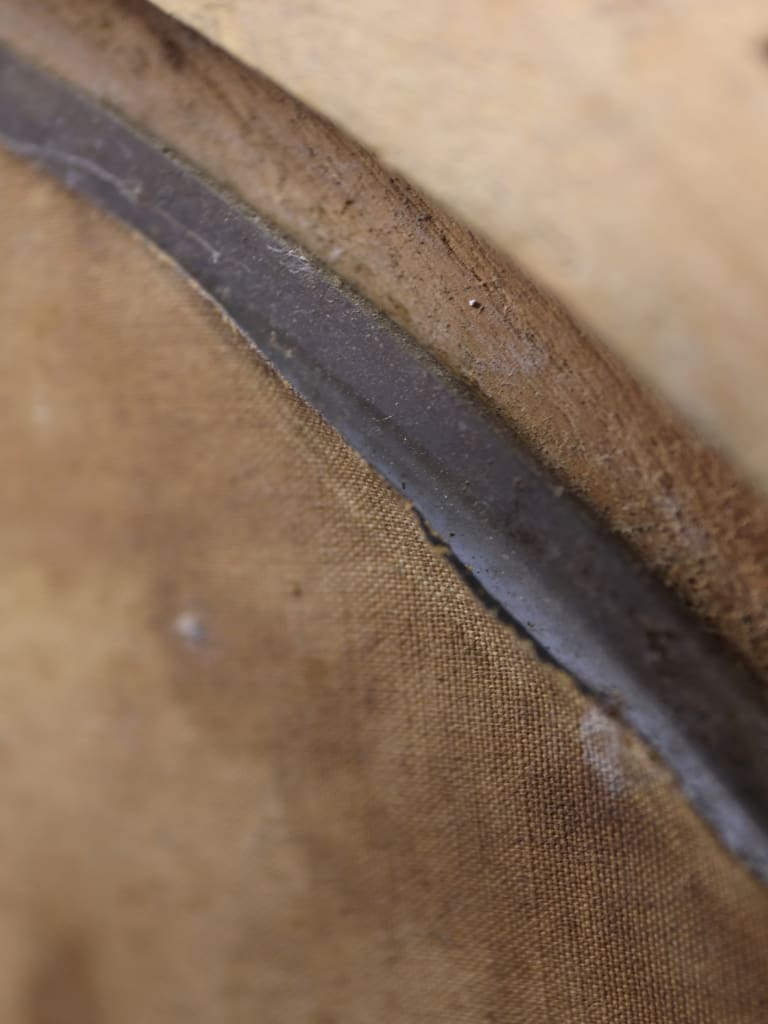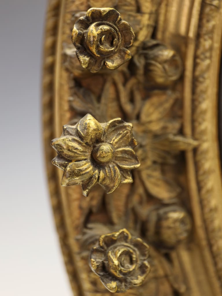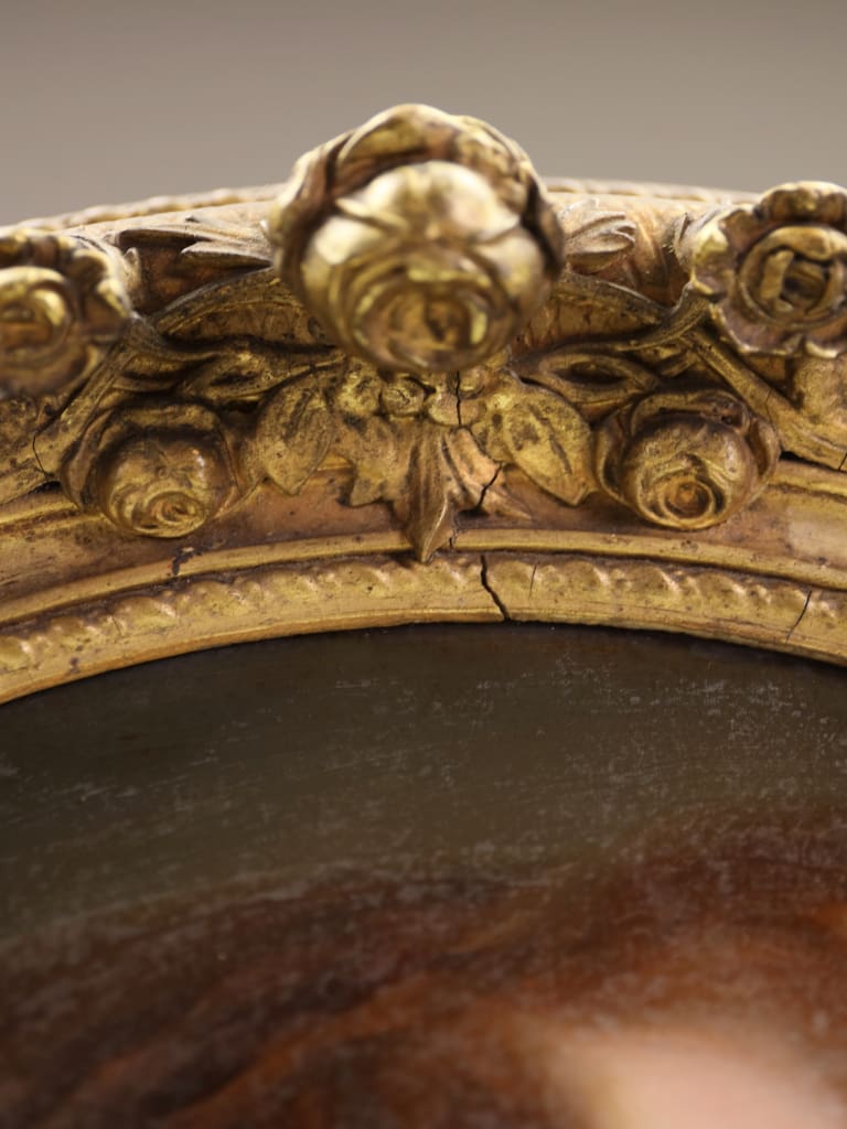 The carved oval frame is in good antique condition. There are minor age-related losses to the gilding and gesso, particularly around the outer edges, which reveal the warm historical bole underneath.
