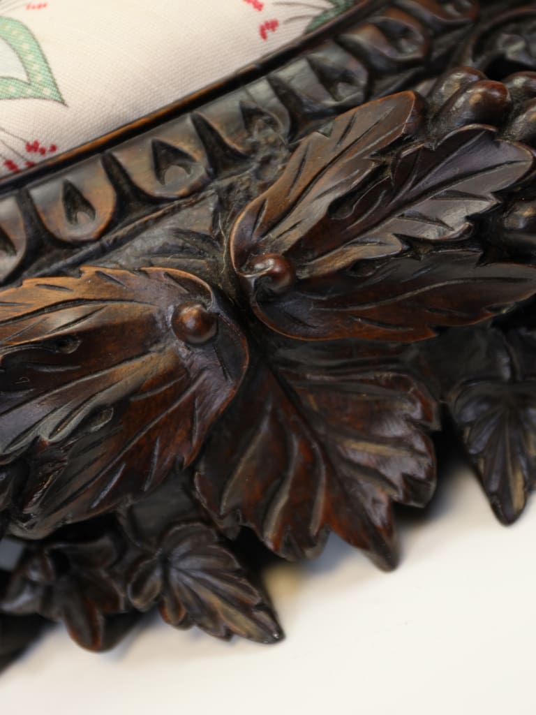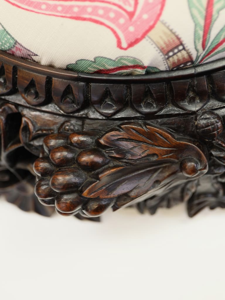 This is an extraordinary example of High Victorian Naturalism, a period where the boundaries between furniture and sculpture became beautifully blurred. Unlike standard stools of the era that rely on turned legs for support, this piece features a continuous, architectural apron that serves as a 360-degree canvas for a master woodcarver.