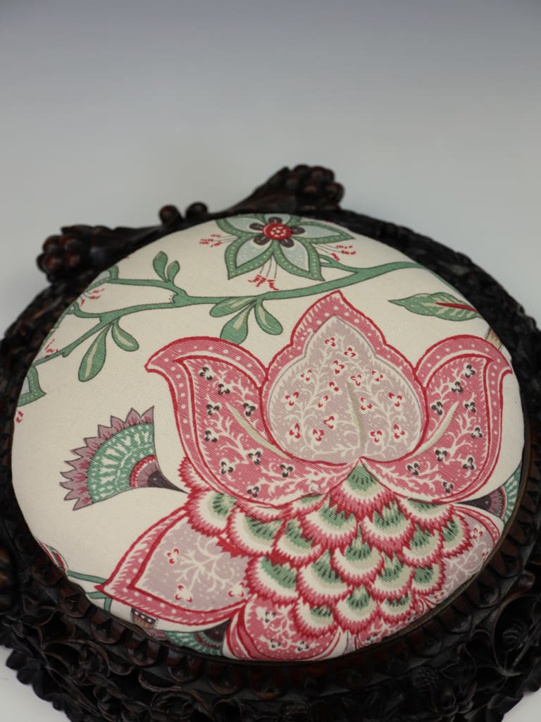 The fabric has been meticulously "centre-matched" so that the most beautiful floral elements of the print are perfectly poised atop the stool, ensuring the piece looks magnificent from every angle.