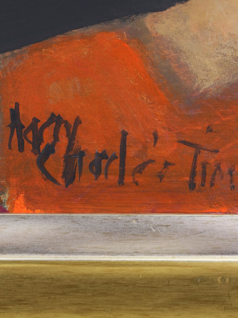 Harry Charles Tim brushwork reveals a mastery of surface and tone — layered, expressive, and yet deliberately economical — inviting the viewer into a contemplative exchange with the subject. Signed by the artist and presented in a complementary gilt-edged frame, this work is an exceptional example of Tim’s modernist portraiture.