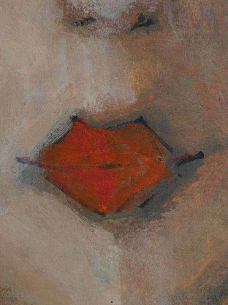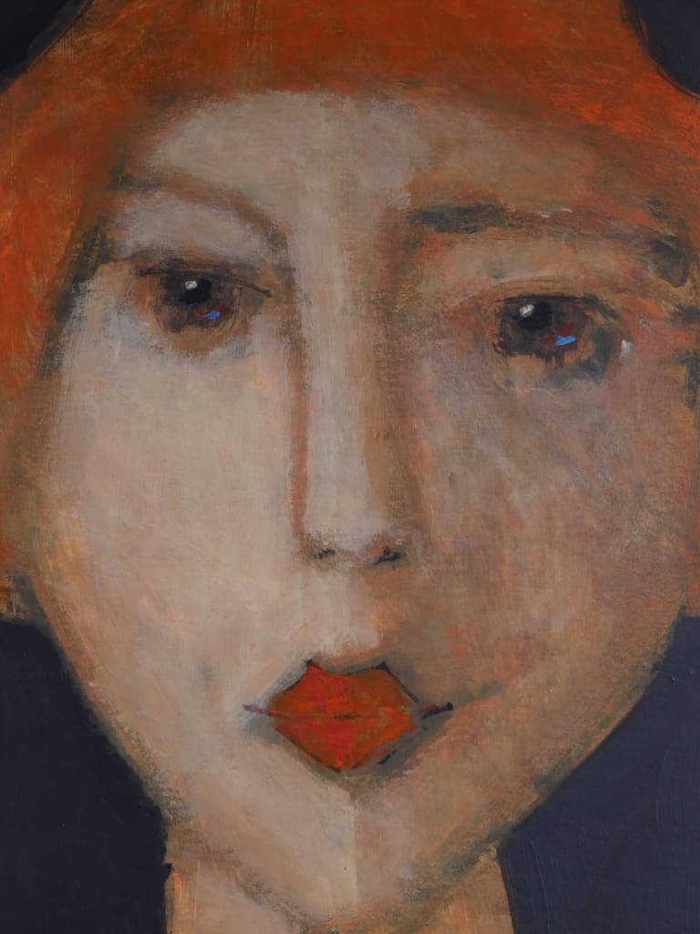 Rendered in a confident, sculptural style, Adrianna depicts a stylised female figure distinguished by her elongated features and poised stillness. The artist’s use of a deep, muted ground contrasts beautifully with the warmth of the sitter’s copper tones and vivid vermilion dress, achieving a sense of both quiet intensity and timeless modernity.