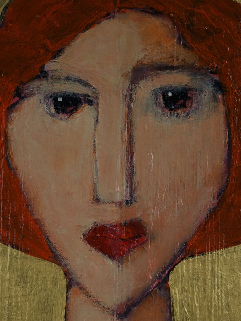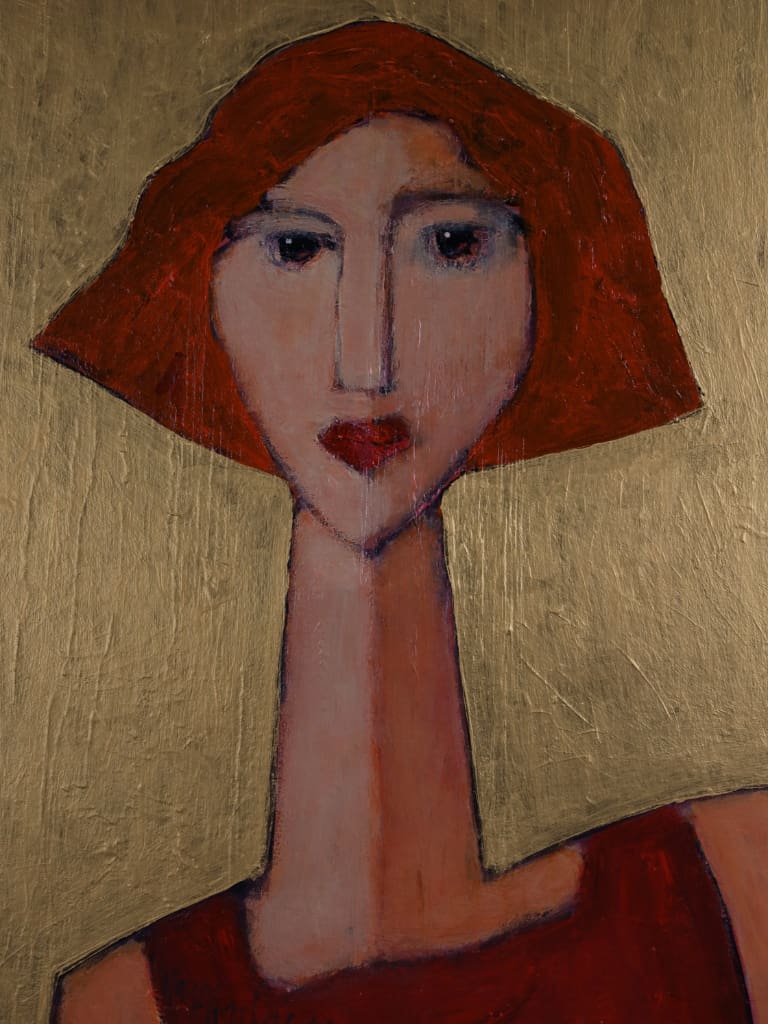 Executed in rich, expressive layers, the palette of burnished reds and ochres is set against a luminous gold ground, imbuing the composition with warmth and an almost iconic presence. The delicate modulation of tone and texture demonstrates Tim’s assured handling of oil and his subtle exploration of character through abstraction.