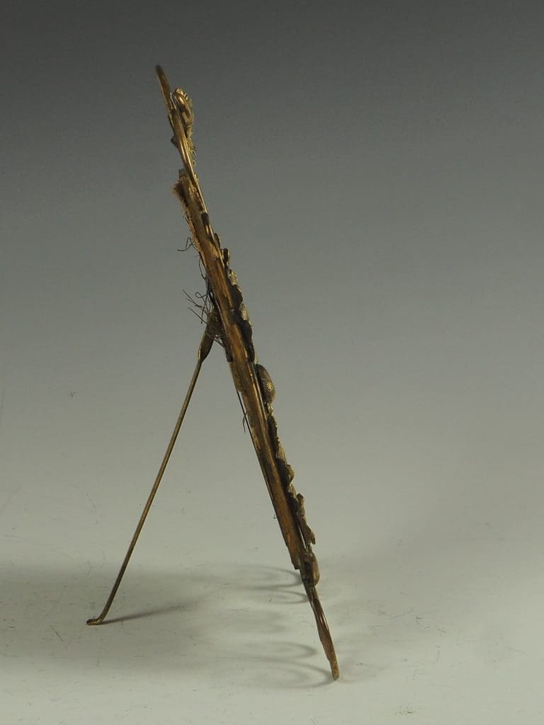 The frame stands on a folding easel stand.