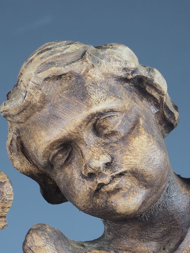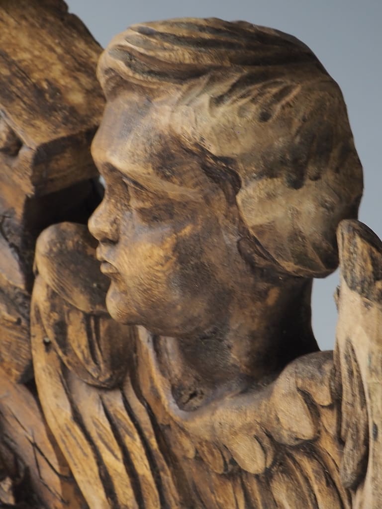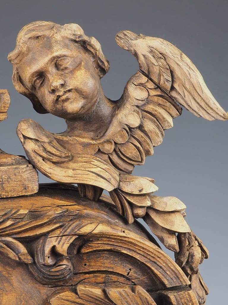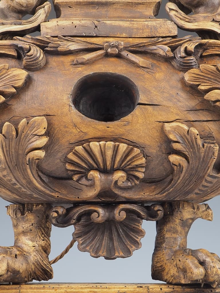 The lamp is elegantly supported by a pair of claw feet, which not only provide stability but also add a touch of grandeur to its overall design. The centrepiece of this remarkable piece is a beautifully detailed reliquary adorned with two cherubs, symbolising protection and watchfulness, making it a captivating focal point.