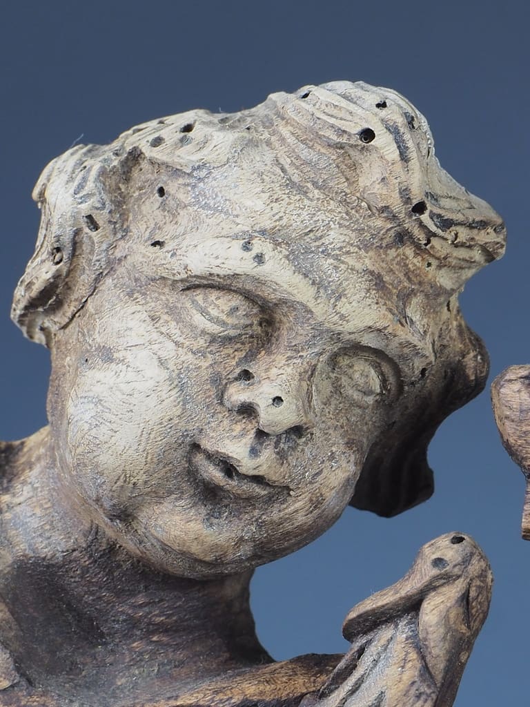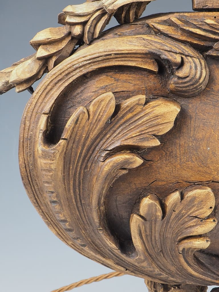 The wood has been treated for historic woodworm holes, which are inactive. This treatment ensures the longevity and durability of this exquisite lamp.