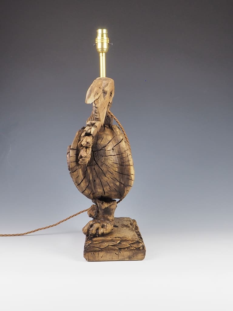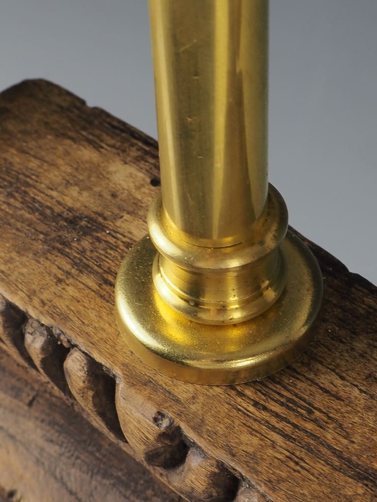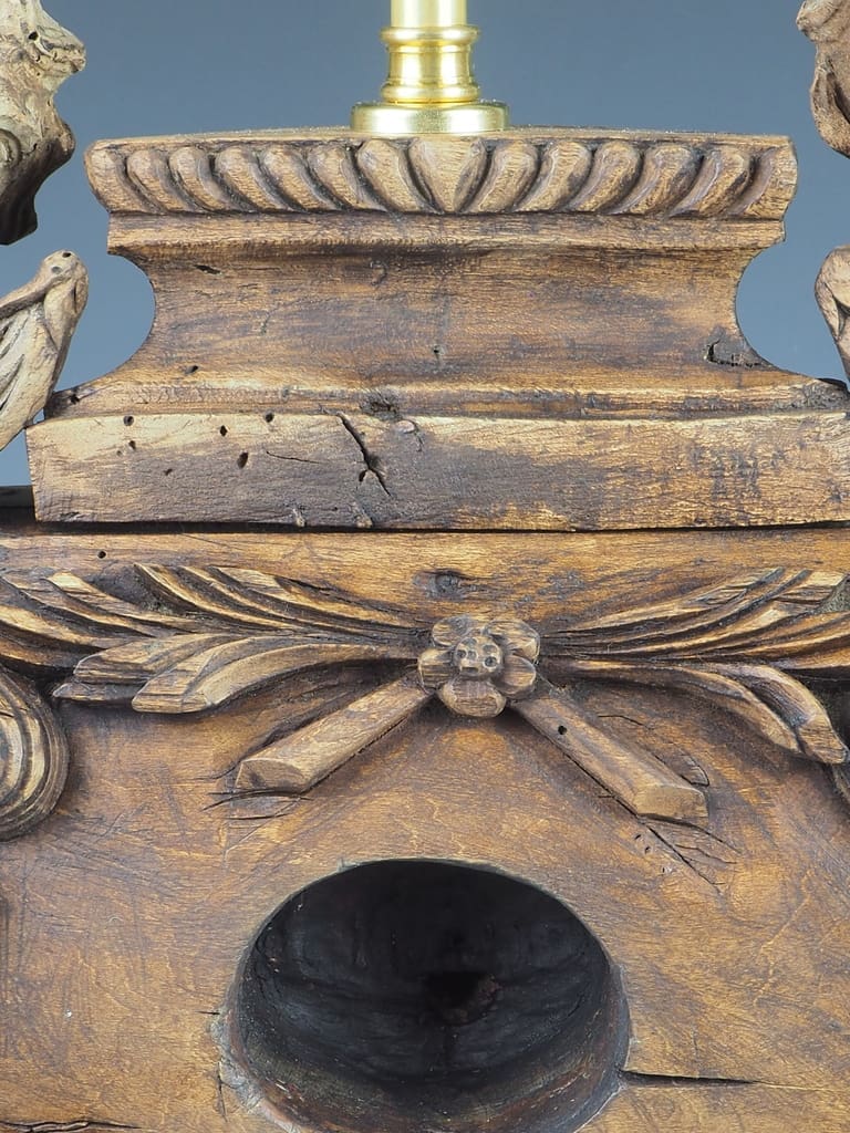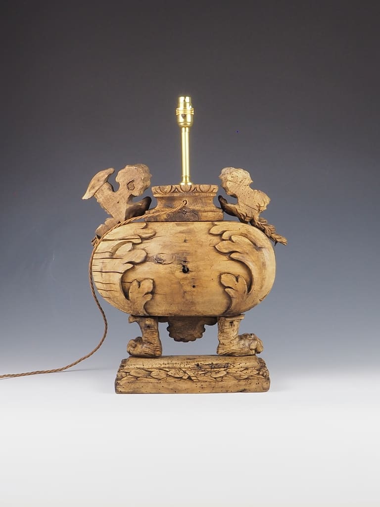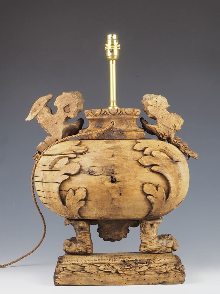 It is important to note that the wood has been treated for historic woodworm holes, which are inactive, ensuring the longevity and durability of this exquisite lamp. This attention to detail not only enhances the lamp's aesthetic appeal but also guarantees its safety and usability in contemporary settings.
