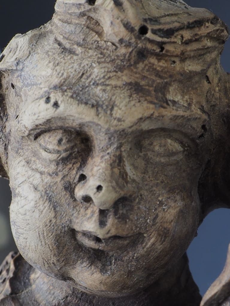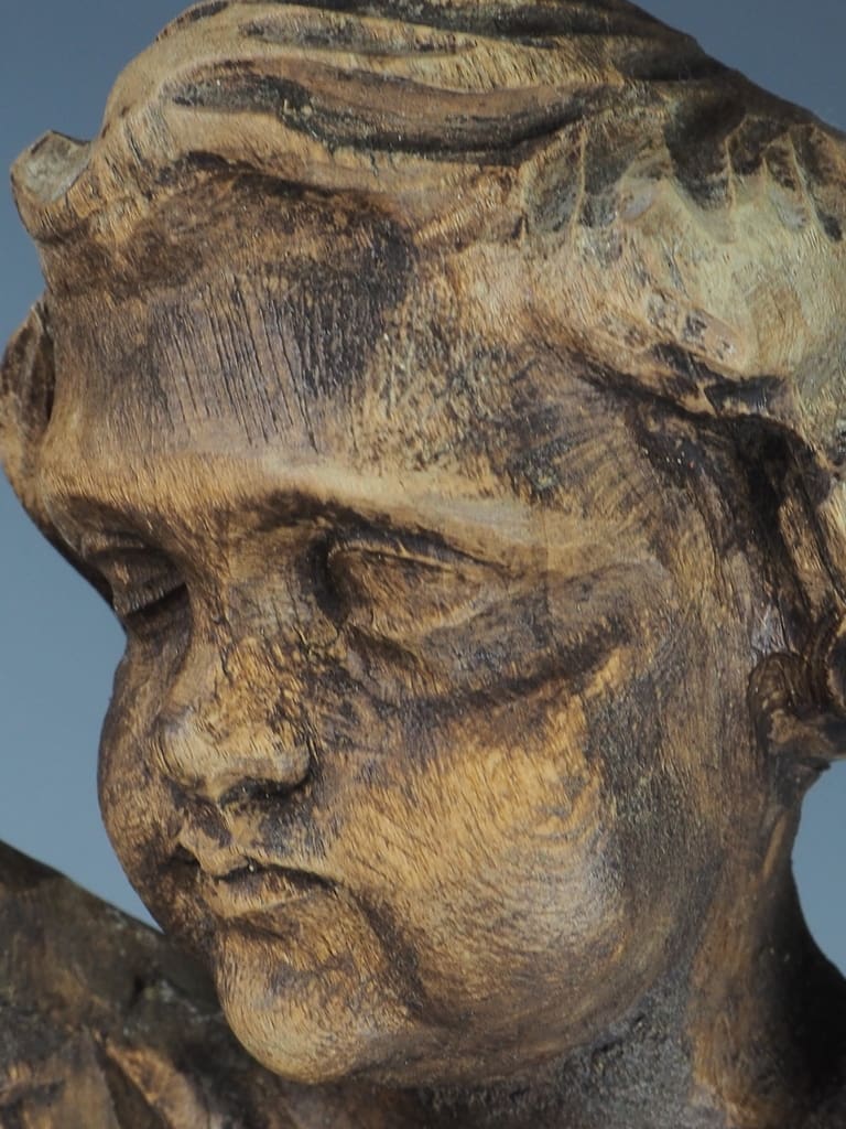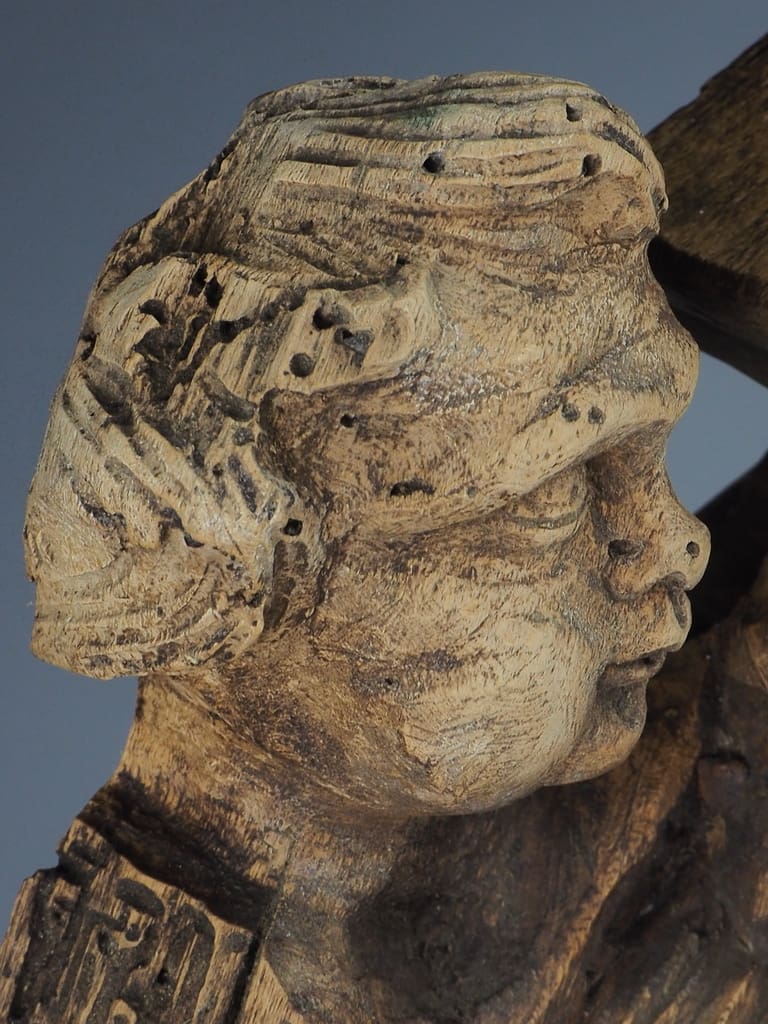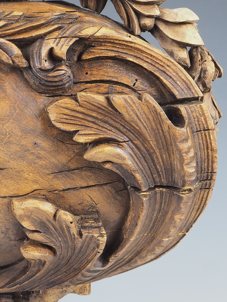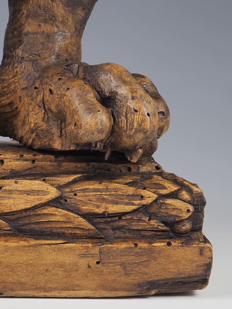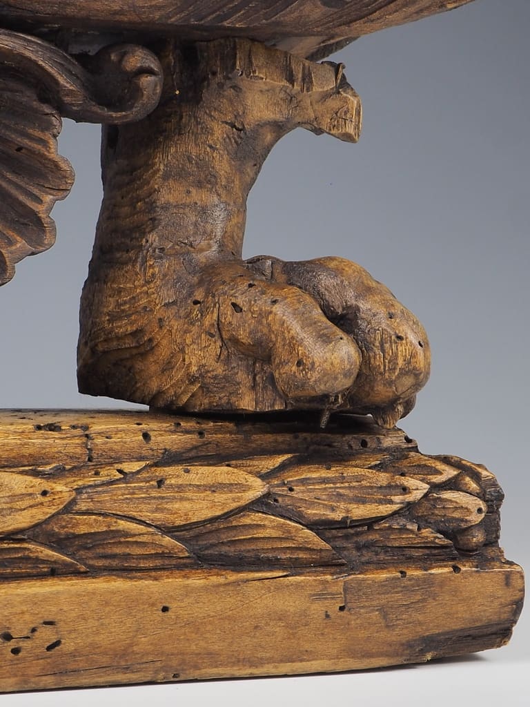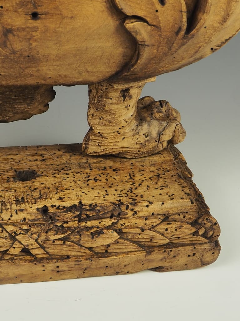 This table lamp has been thoughtfully converted from its original reliquary form, allowing it to serve as both a functional lighting source and a striking decorative element. The stunning age of the wood is evident, with rich patinas and textures that tell a story of its long history.