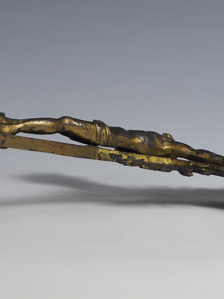 This antique gilt bronze crucifix cross is in good antique condition, showcasing signs of wear consistent with its age. These signs of wear add to its historical charm without detracting from its overall appearance.