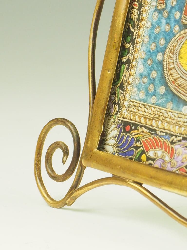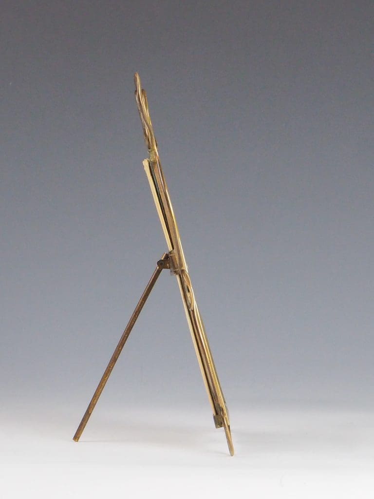 The original brass easel stand leg remains intact and functional, supporting the frame securely. It exhibits minor wear but no structural issues.