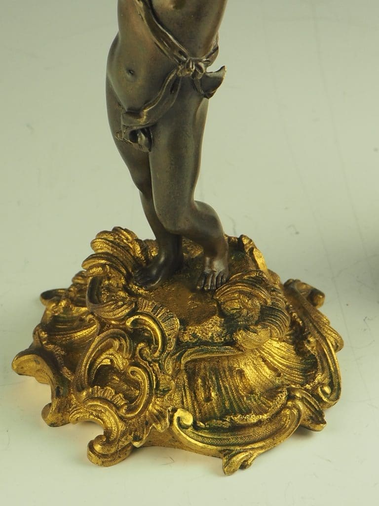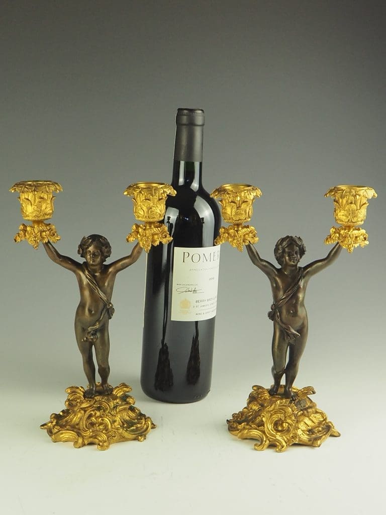 Whether displayed as a centerpiece on a dining table or as an accent piece in a grand living room, these bronze and gilt ormolu twin cherub candelabras are sure to captivate and impress with their intricate detailing and timeless beauty.