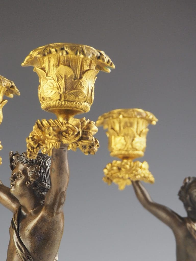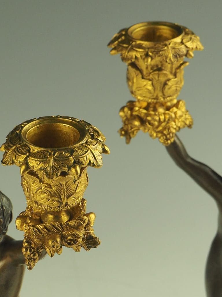 The cherubs are depicted holding twin gilt bronze candle candelabras, which are intricately decorated with delicate vine leaves and grapes. These decorative elements add a touch of elegance and sophistication to the overall design.