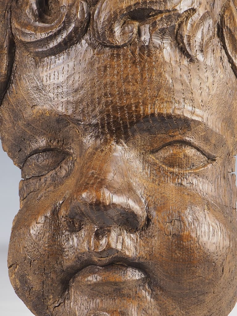 The piece showcases exceptional carving detail, capturing the delicate features and serene expression of the cherub with remarkable precision. The rich oak grain adds warmth and character, making it a perfect accent for any room, whether displayed in a traditional or contemporary setting.