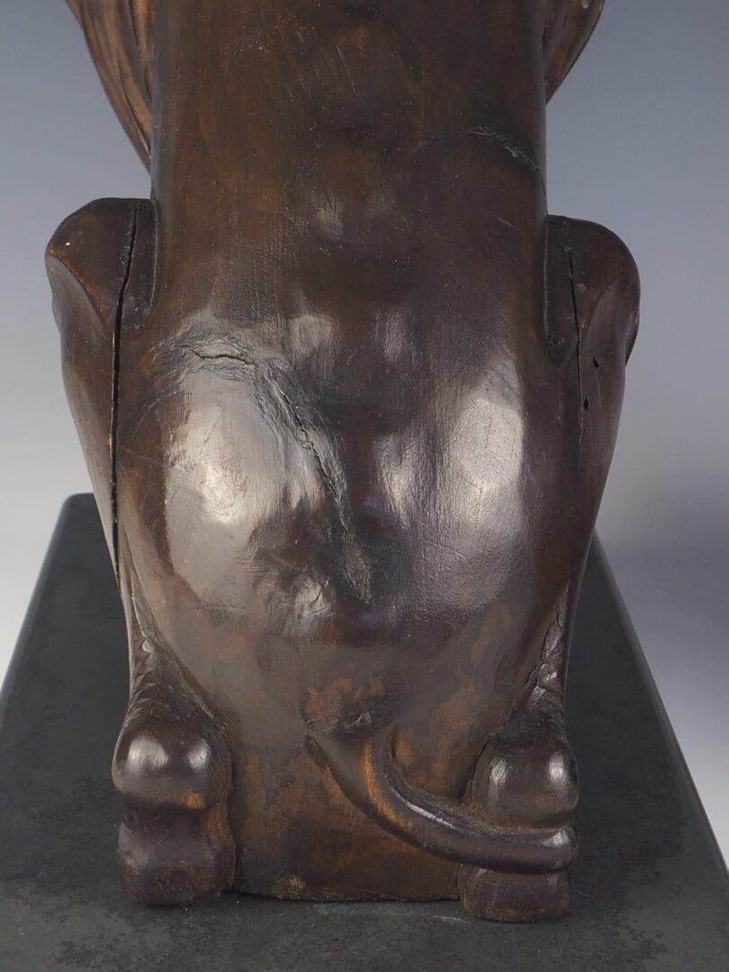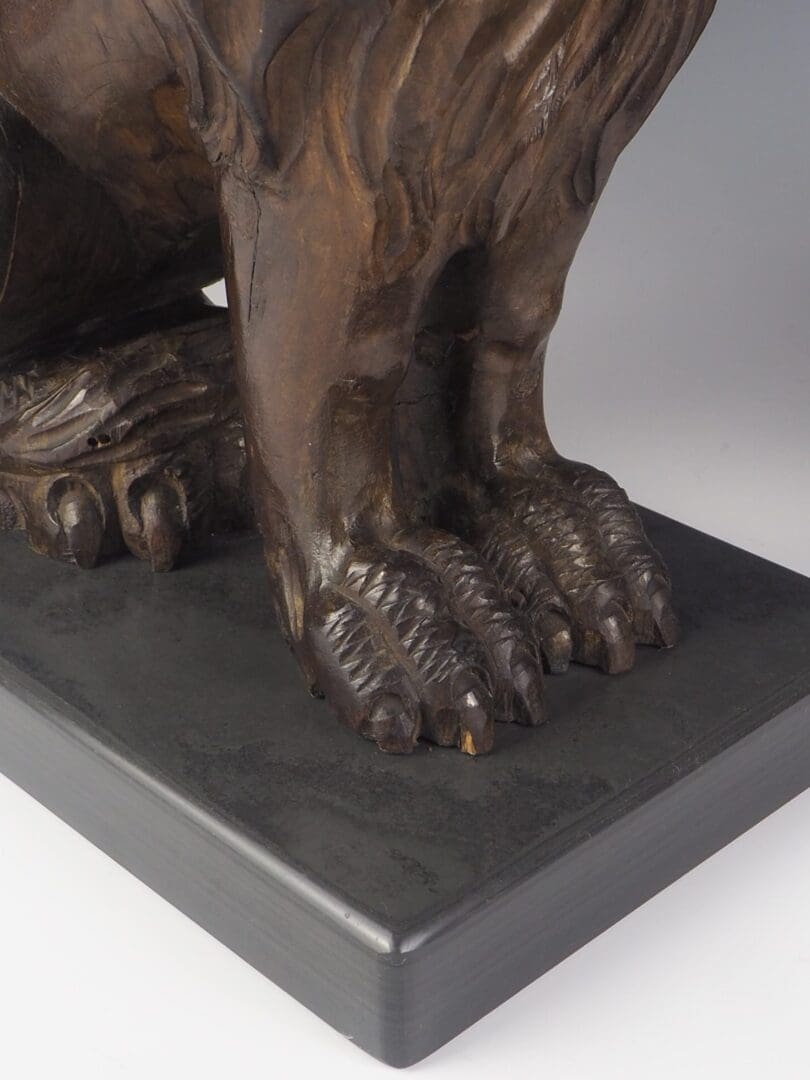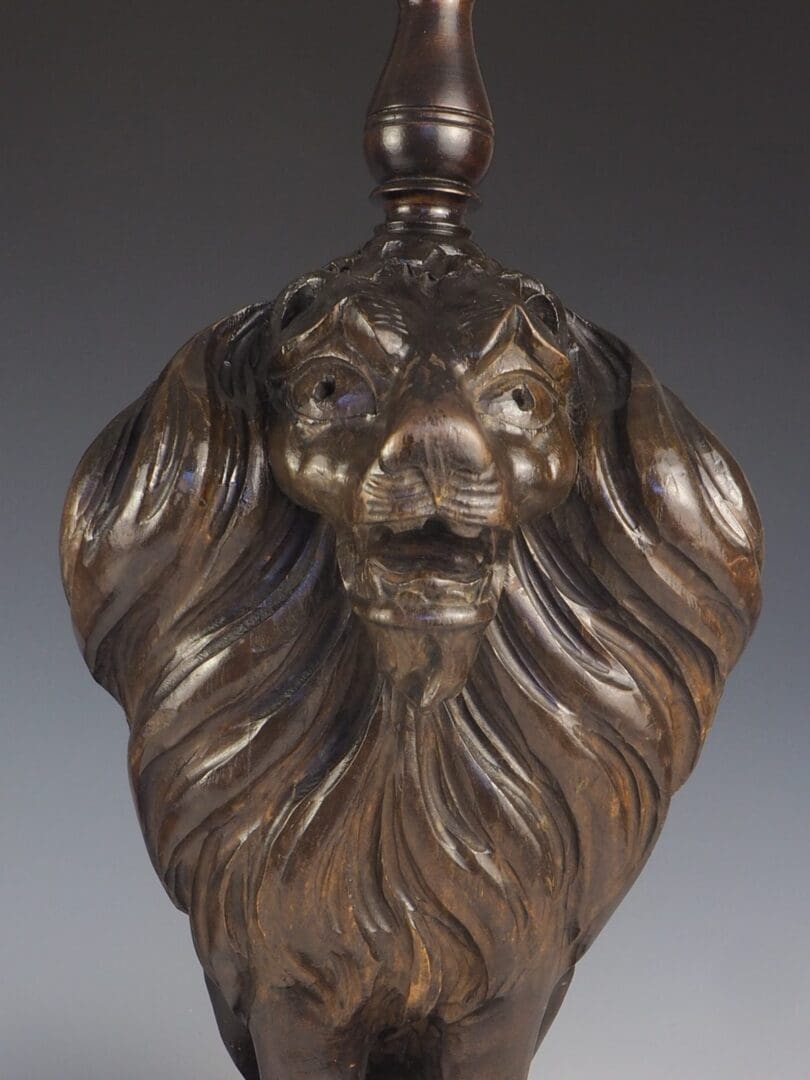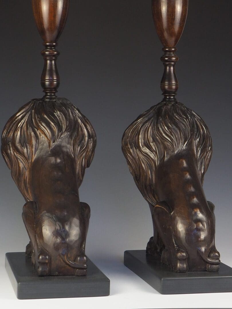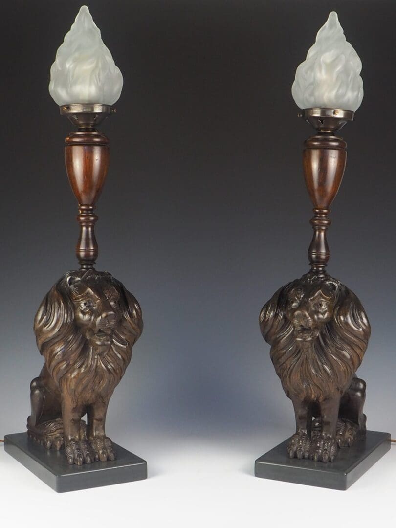 A stunning pair of 19th Century Carved Oak Lion Lamps that exude elegance and sophistication. These exquisite table lamps showcase the regal beauty of lions, symbolising majestic power since ancient times. Each lamp features a magnificent lion sitting proudly on a grey slate base, supported by its front legs.