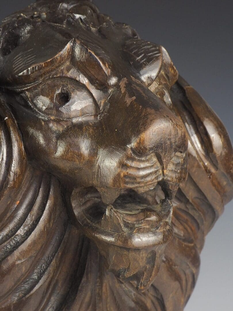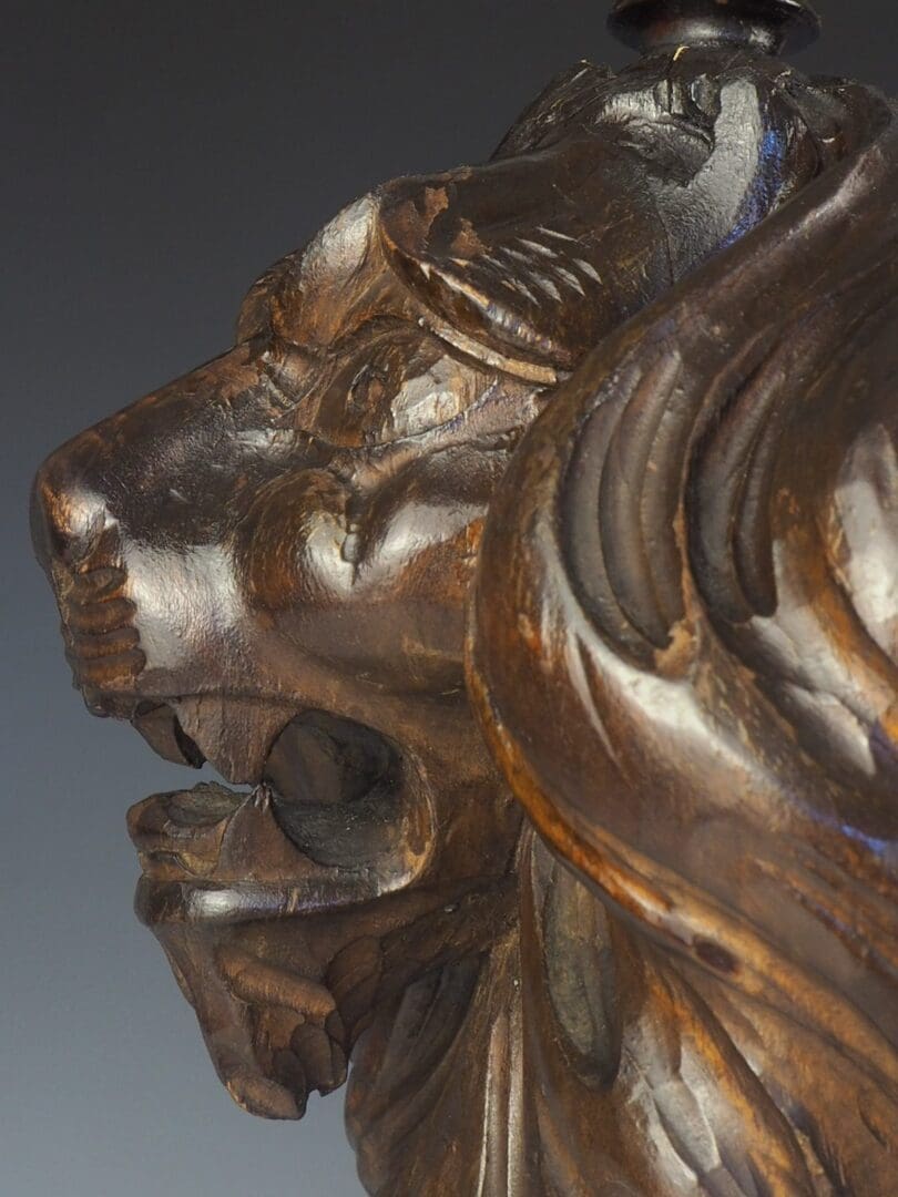 A stunning pair of 19th Century Carved Oak Lion Lamps that exude elegance and sophistication. These exquisite table lamps showcase the regal beauty of lions, symbolising majestic power since ancient times. Each lamp features a magnificent lion sitting proudly on a grey slate base, supported by its front legs. The attention to detail is impeccable, with the wavy curls in the lion's mane expertly carved and the anatomy masterfully treated.