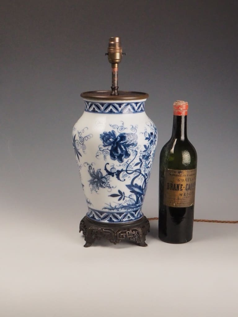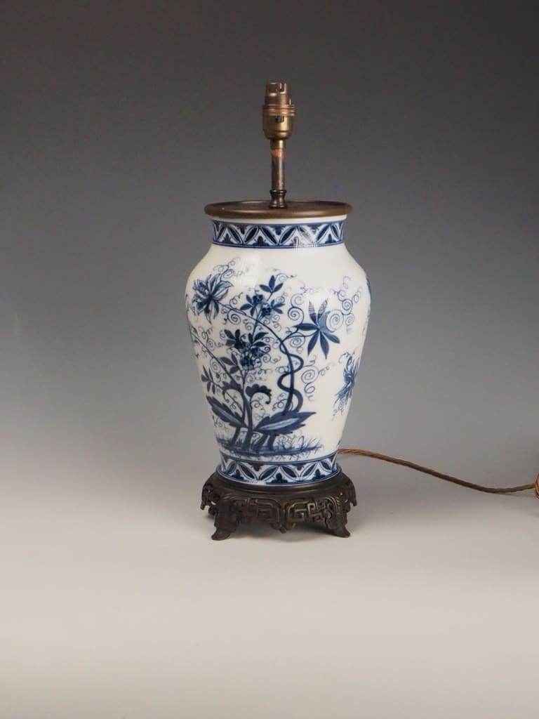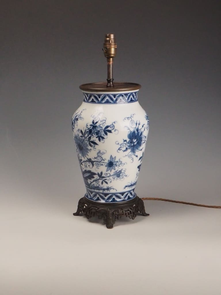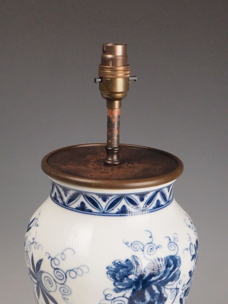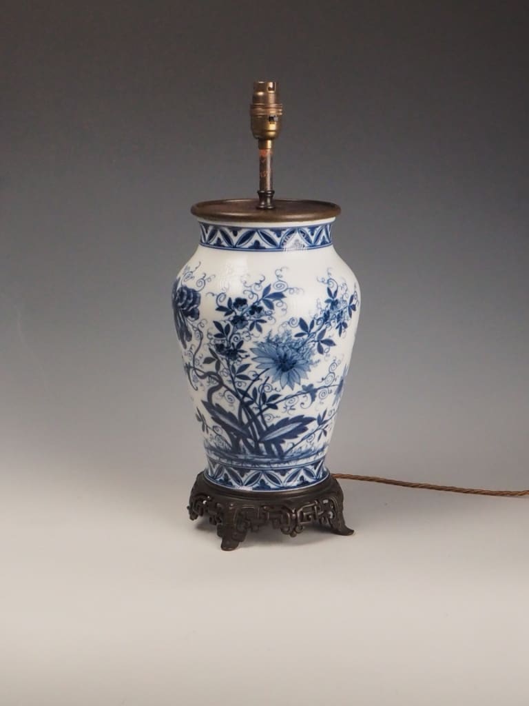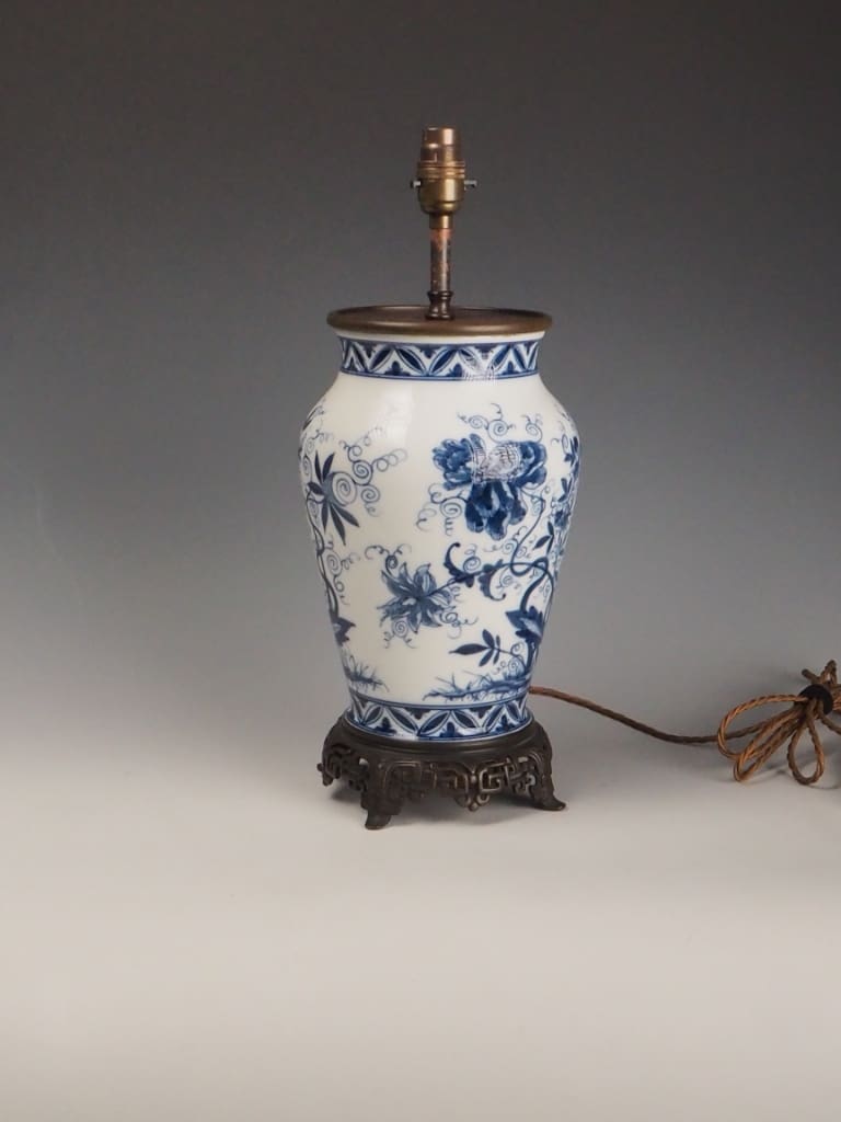 A beautifully preserved antique Chinese blue and white porcelain table lamp, originally made as an oil lamp and later thoughtfully converted for electric use. This lamp features an elegant baluster-shaped porcelain body, hand-painted with a traditional floral and foliate design, encircled by a classic scrolling border—hallmarks of Chinese ceramic artistry.
