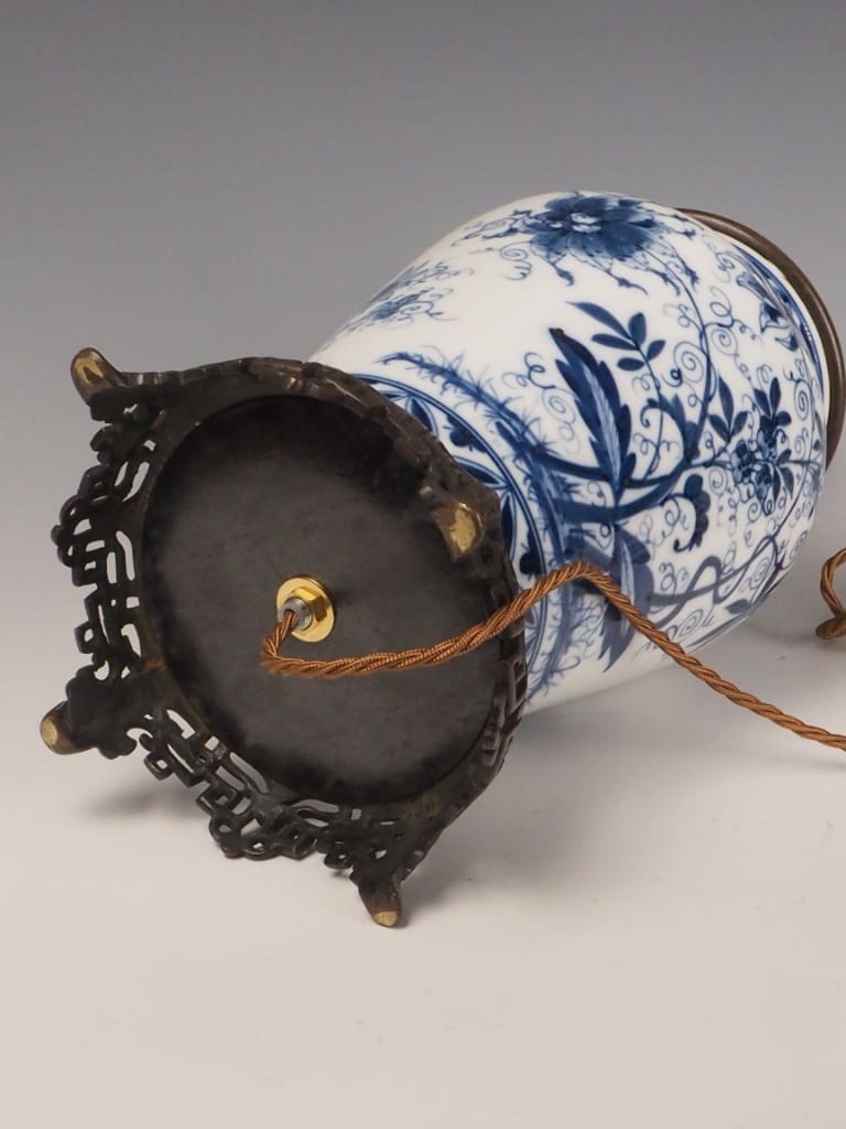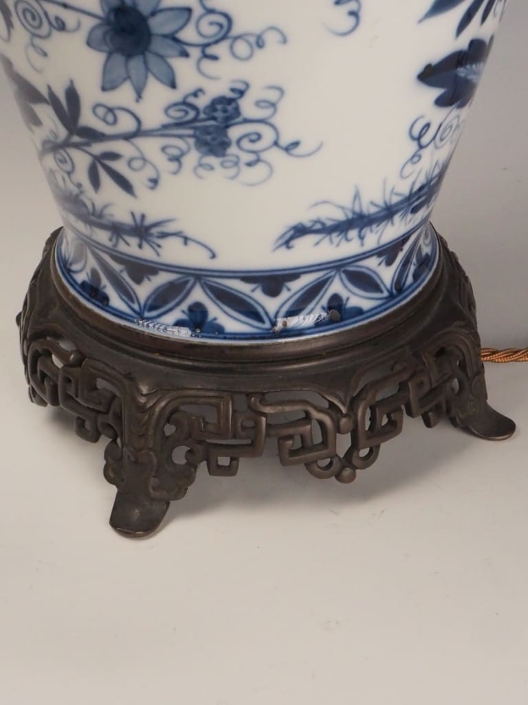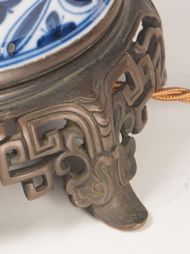 The lamp is mounted on a finely cast oriental-style bronze base, showcasing intricate detailing that complements the delicacy of the porcelain above. Together, they form a harmonious blend of fine ceramic and metalwork, typical of 19th to early 20th-century Chinese export pieces made for Western markets.