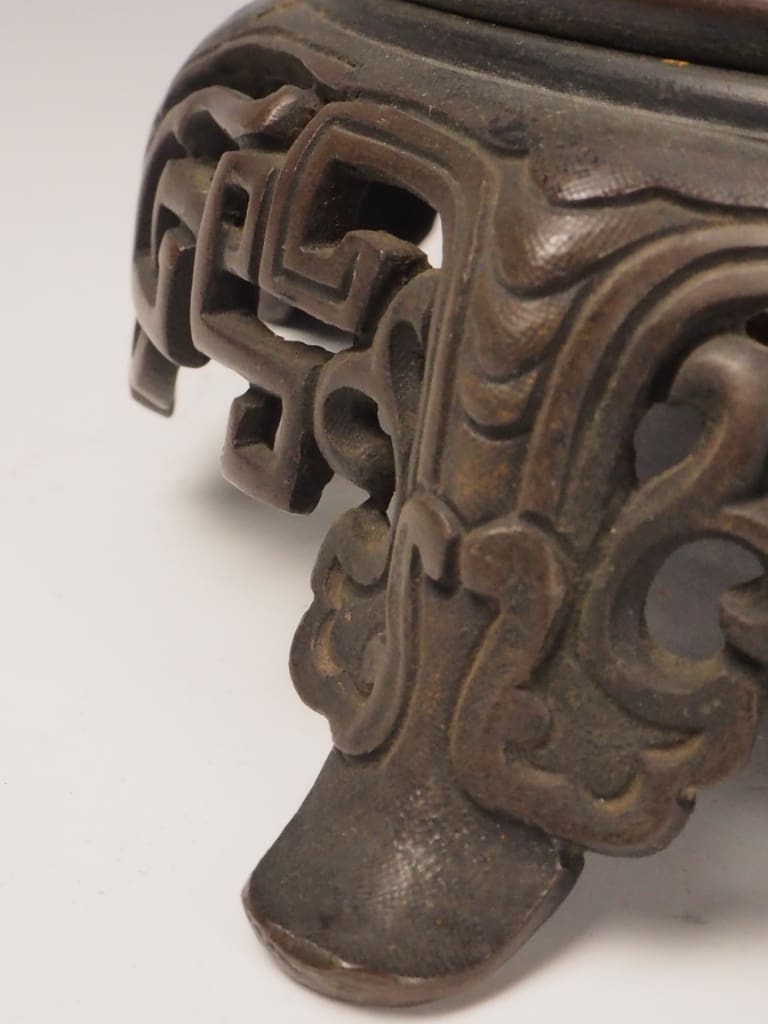 Ornate bronze base with a rich, aged patina. Securely attached and stable on a flat surface.