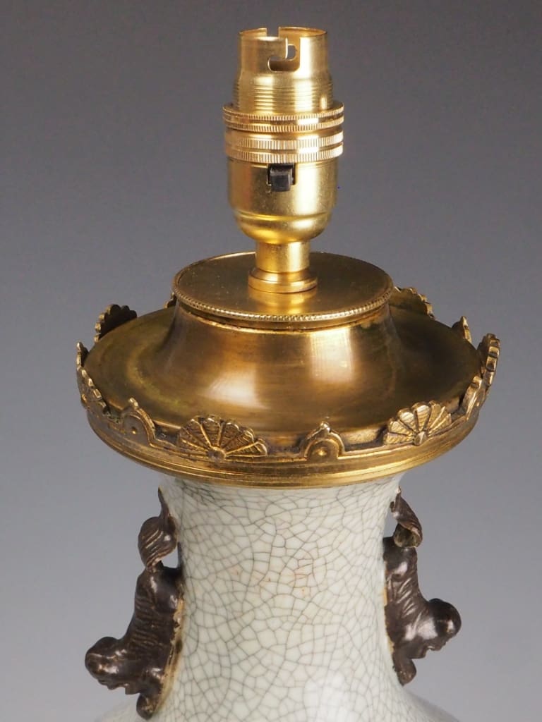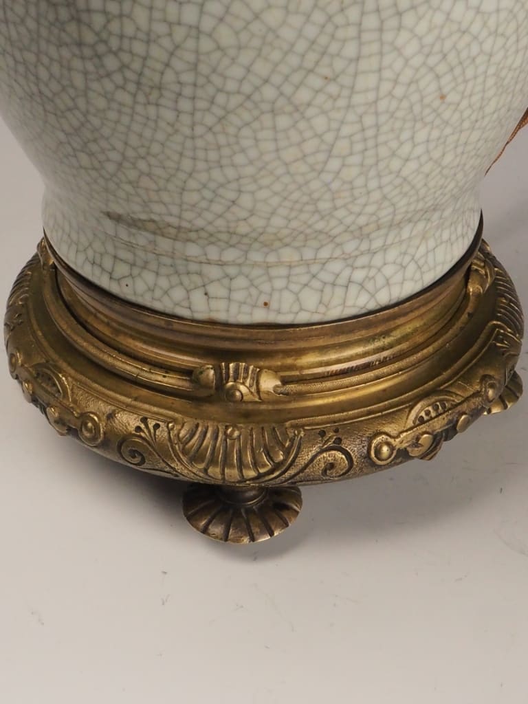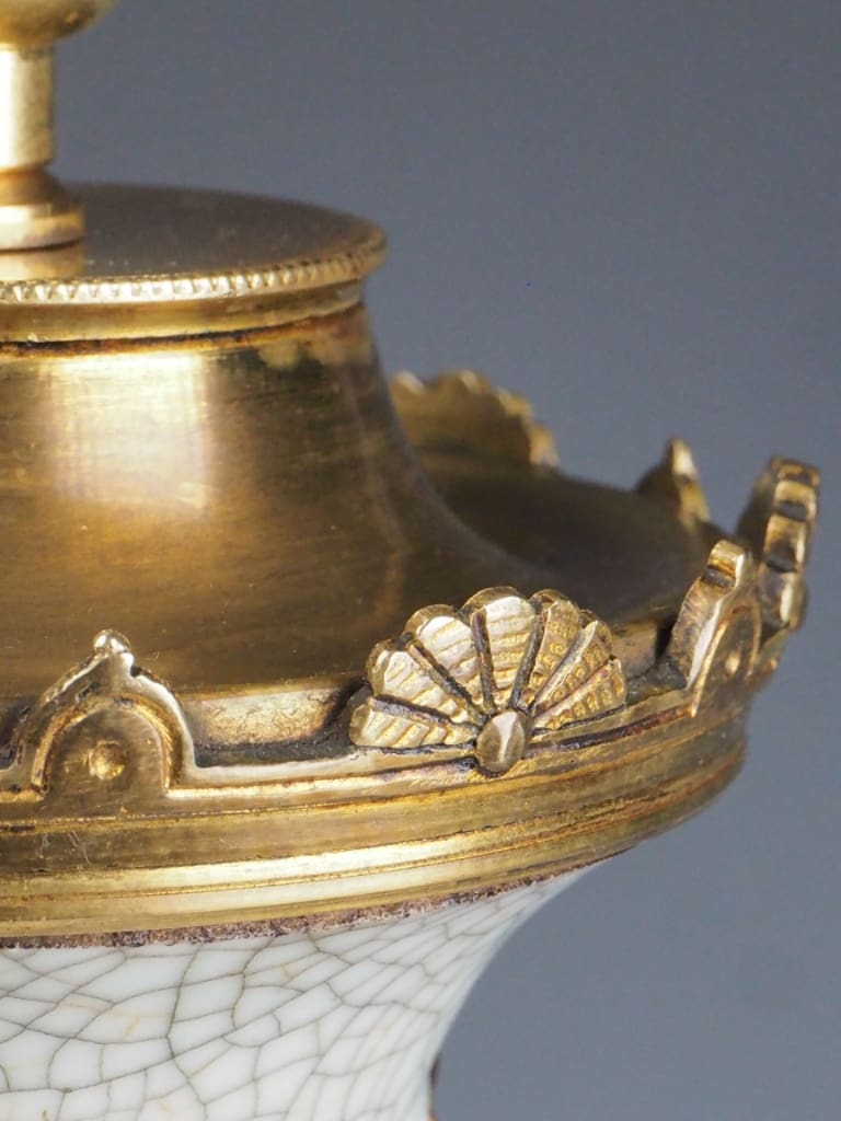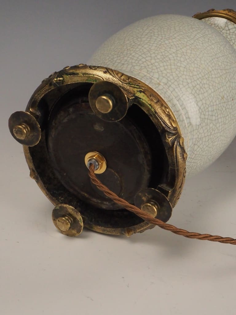 The lamp features a distinctive crackle-glazed porcelain body in an elegant off-white tone, a decorative technique favoured in Chinese ceramics for centuries. The controlled crazing effect (crackle glaze) enhances the depth and character of the surface, creating a fine network of lines across the glaze, which was often valued both aesthetically and symbolically.