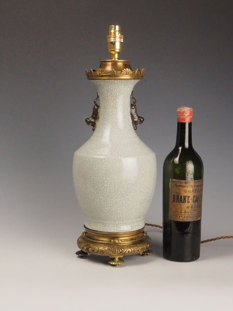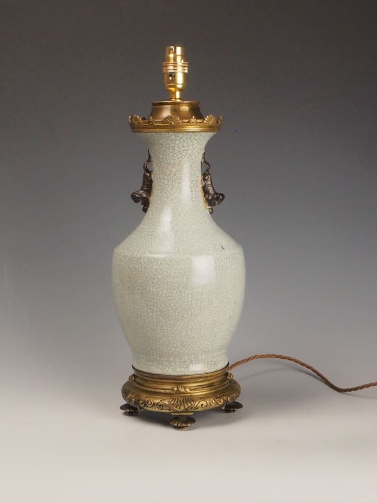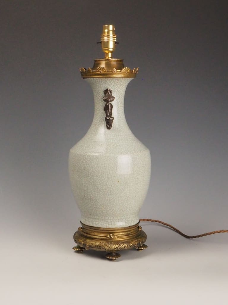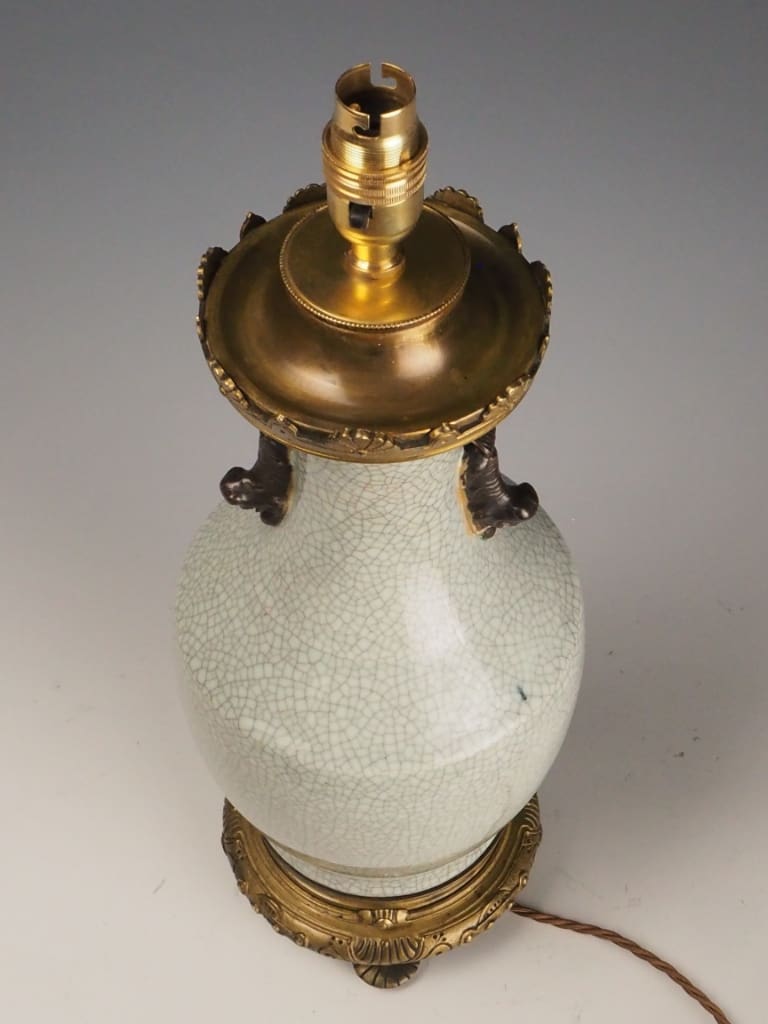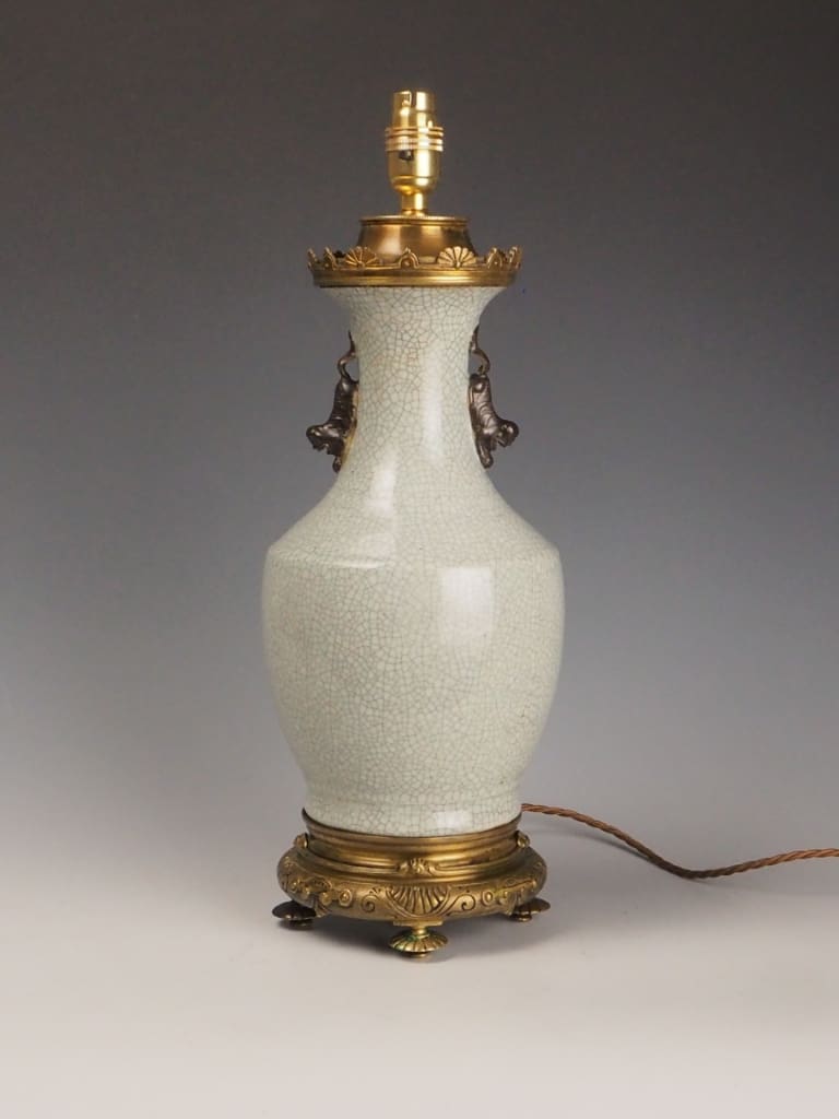 The lamp features a distinctive crackle-glazed porcelain body in an elegant off-white tone, a decorative technique favoured in Chinese ceramics for centuries. The controlled crazing effect (crackle glaze) enhances the depth and character of the surface, creating a fine network of lines across the glaze, which was often valued both aesthetically and symbolically.