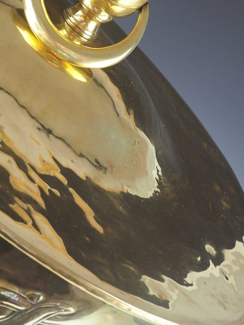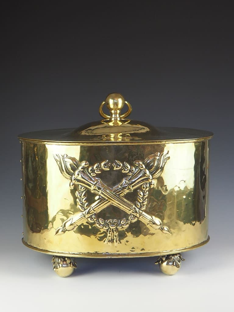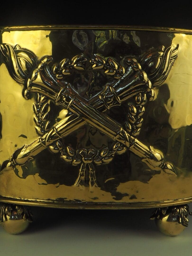 Heavy gauge hand riveted in brass, complete with embossed torchere motif and repousse detailing.Â