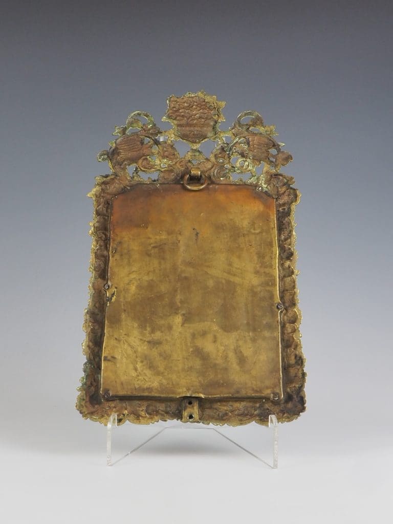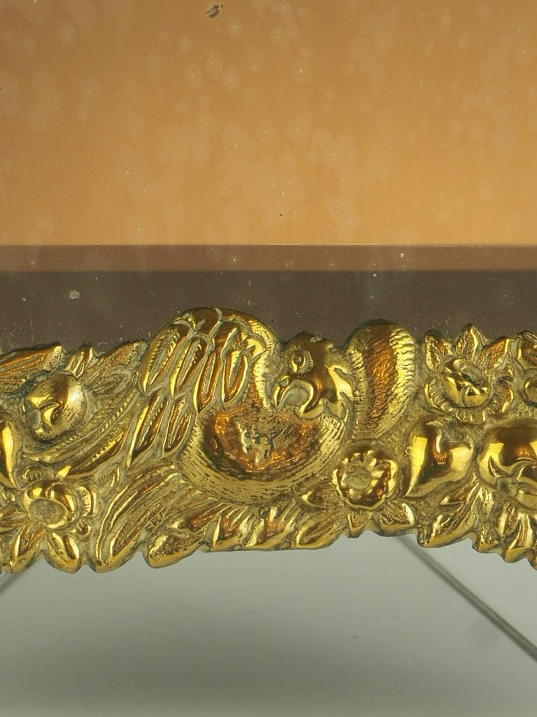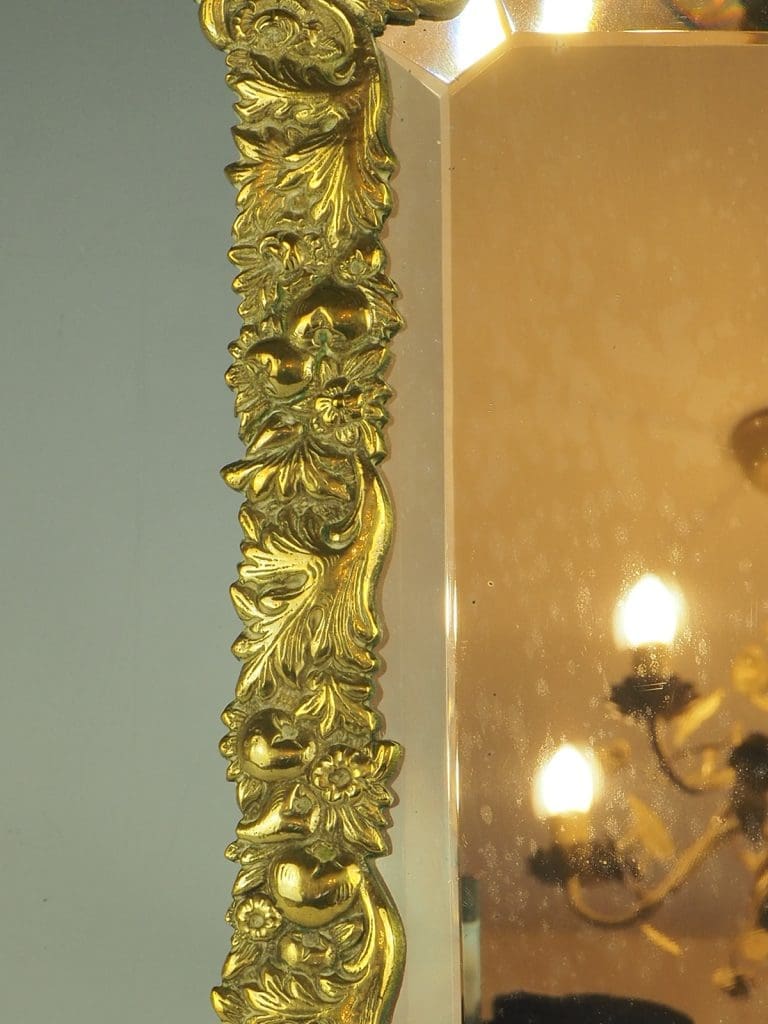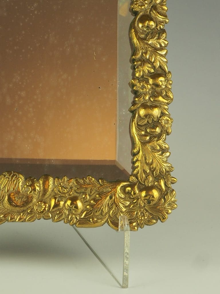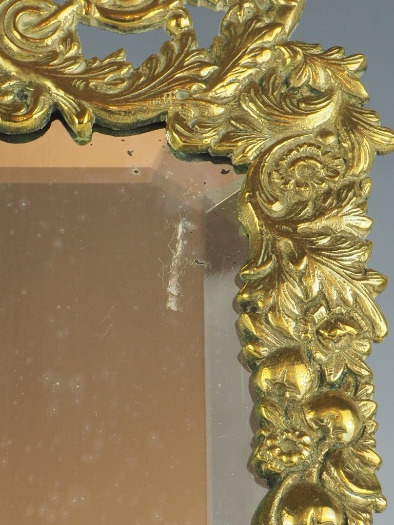 The ornately framed design showcases the intricate detailing and attention to detail that was characteristic of the Victorian period. Made from brass, the frame exudes a sense of elegance and sophistication. The beveled mirror not only adds depth and dimension to the piece but also enhances its overall aesthetic appeal. With its original back intact, this mirror retains its authenticity and historical value, making it a valuable addition to any antique collection or as a statement piece in a traditional or vintage-inspired interior.