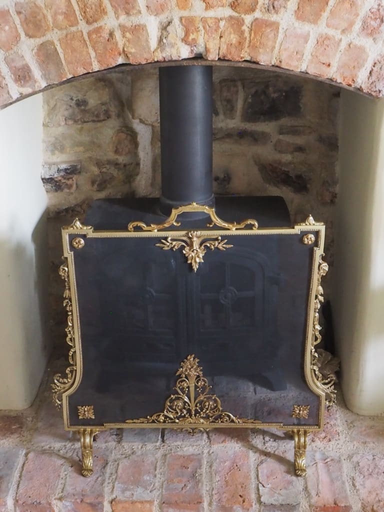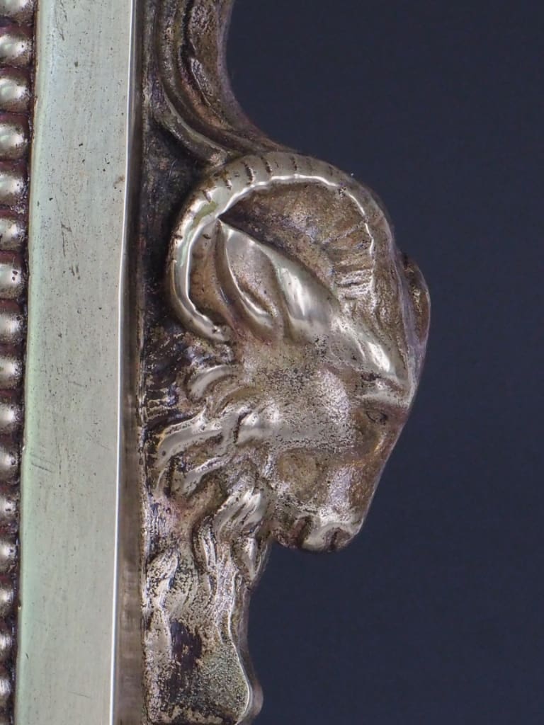 The fire screen is richly decorated with classical scrollwork, floral garlands, and intricate acanthus detailing, all meticulously cast in bronze doré. Prominent rams’ heads—a hallmark of neoclassical design—adorn the corners, enhancing its symmetry and grandeur. The frame rests on four finely detailed feet, each reflecting the refined taste and craftsmanship of the Belle Époque era.