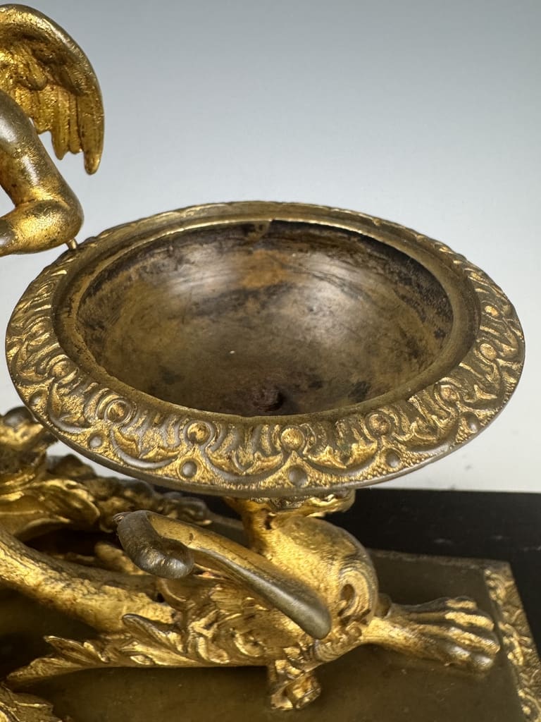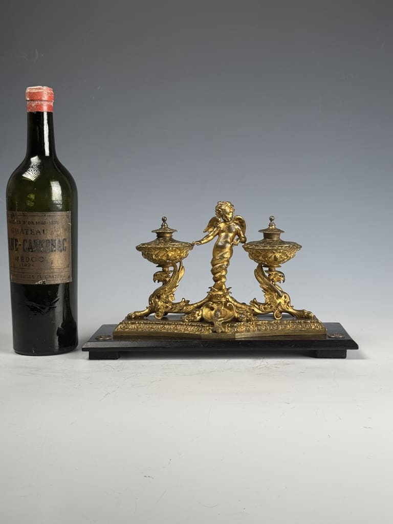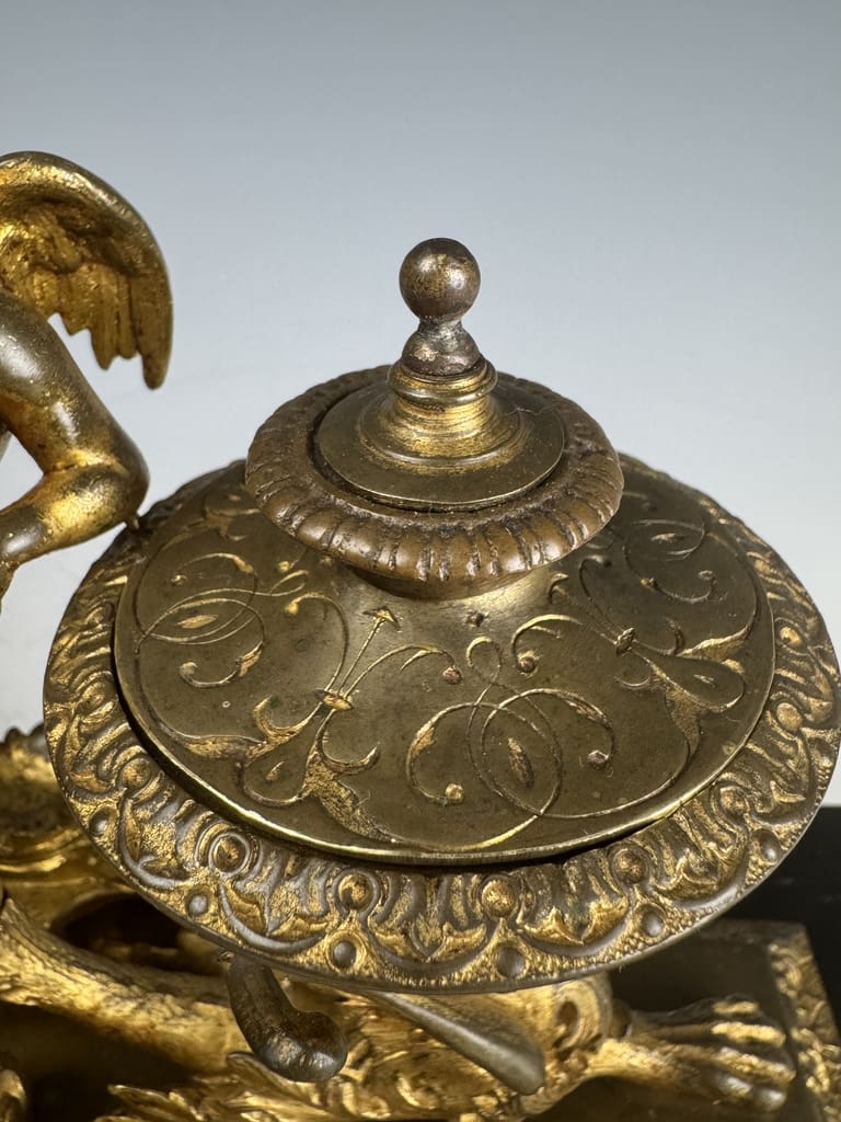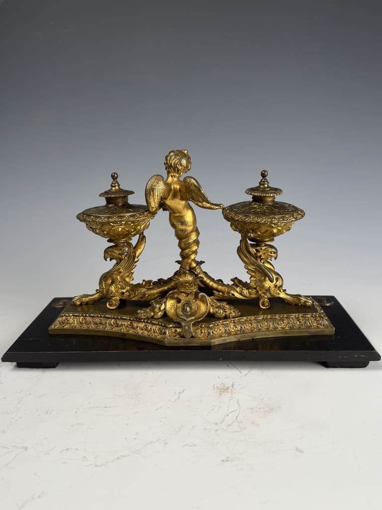 A refined example of 19th-century decorative art, this gilt bronze and ebony inkstand embodies the opulence and classical influences of the period. Resting on a rectangular ebony base, the inkstand is finely decorated with richly cast and chased gilt bronze mounts, showcasing a central putto flanked by two griffins—mythological creatures symbolizing guardianship and strength.