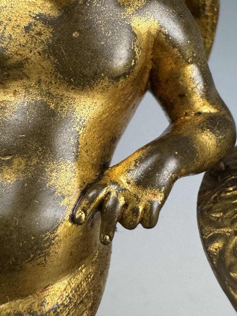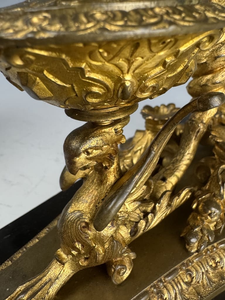 The putto, a cherubic figure often associated with love and divine presence in Renaissance and Neoclassical art, adds a romantic and allegorical touch. The griffins, with their lion bodies and eagle heads, reflect the 19th century's fascination with ancient mythology and symbolic ornamentation.
