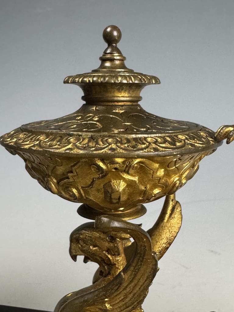 Supporting two covered inkwells, this piece is not only functional but also serves as a statement of luxury and learned taste. The contrast between the dark, polished ebony and the warm, lustrous gilt bronze evokes the style and craftsmanship of the Second Empire or Napoleon III period in France, when such materials and motifs were highly fashionable among the elite.
