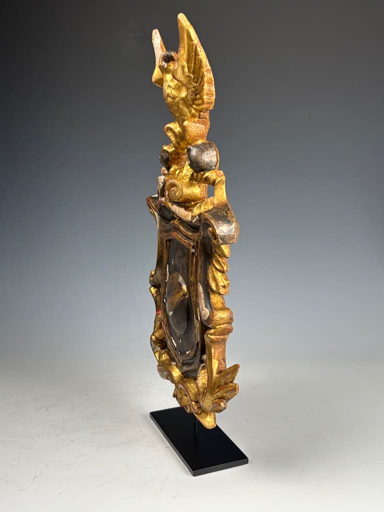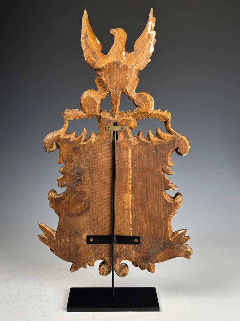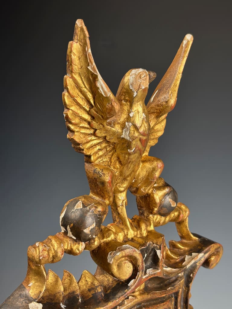 At the top of the crest sits a majestic eagle, intricately carved and perched on a twisted bar. The eagle’s talons grip two gilded spheres, a powerful heraldic symbol often associated with imperial authority, protection, and dominion—motifs used since Roman times and prevalent in Holy Roman Empire and Napoleonic heraldry.