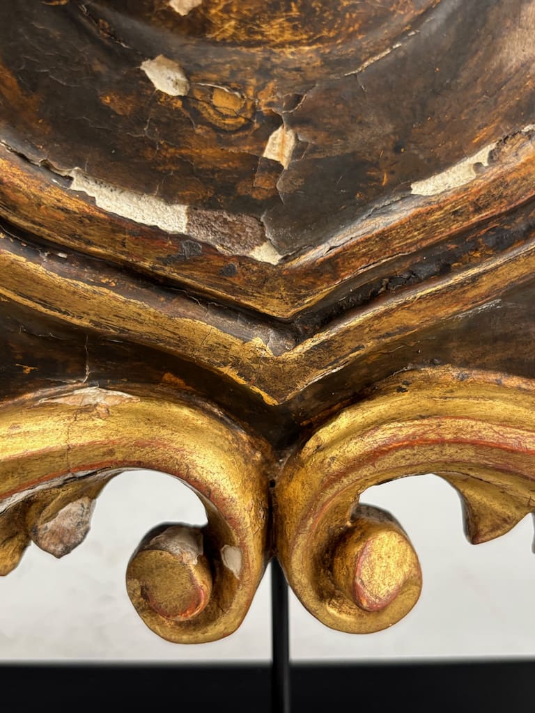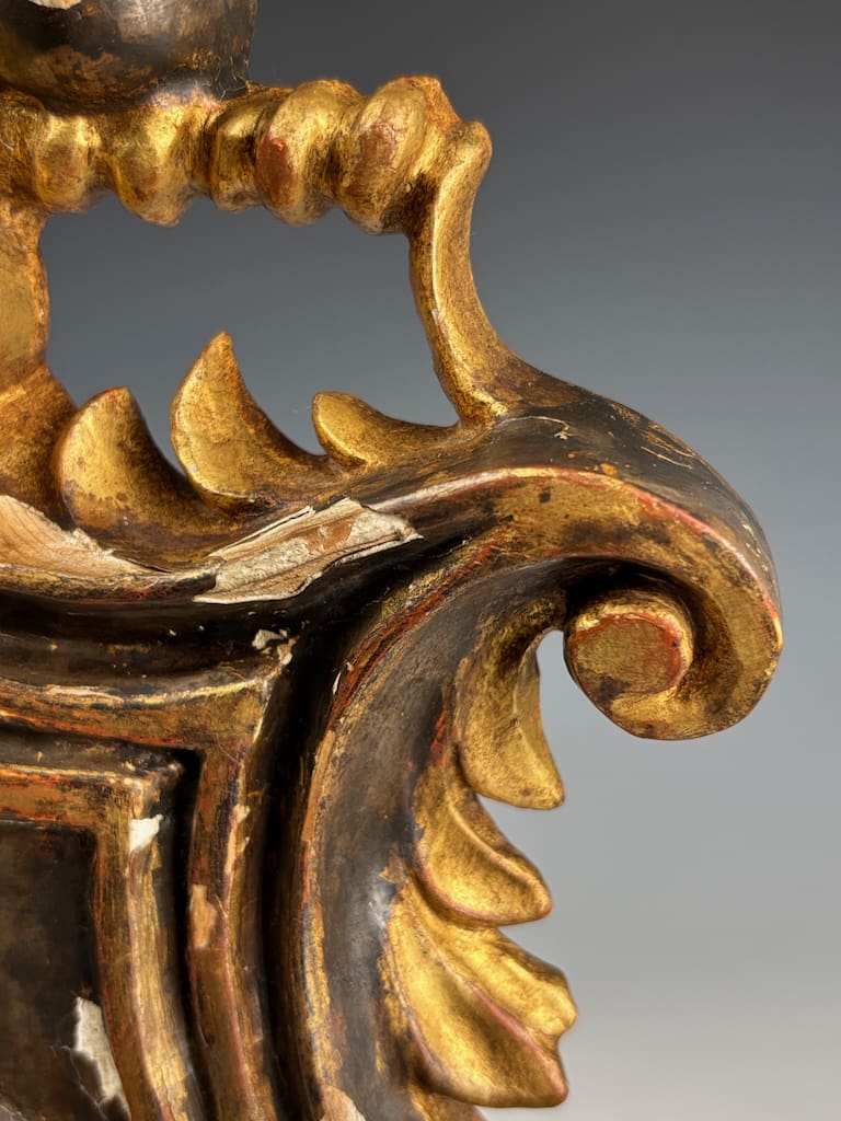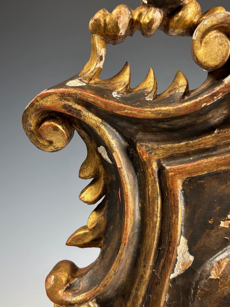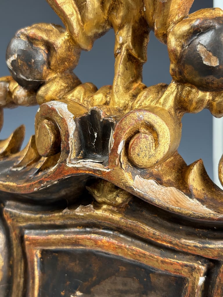This 18th-century carved giltwood and gesso coat of arms is in very good antique condition, with age-related wear consistent with age. The gilt finish shows areas of natural patina, minor rubbing, and small losses, particularly along high points and edges, which enhance its authentic aged character.