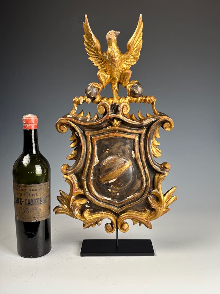 A stunning and rare 18th-century carved giltwood and gesso coat of arms, this exceptional piece exemplifies the grandeur and craftsmanship of early European heraldic art. Rich in symbolic detail, it likely originates from continental Europe—possibly Italy, France, or the Germanic regions—where heraldic crests adorned noble estates, palaces, and institutions.
