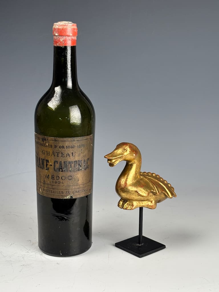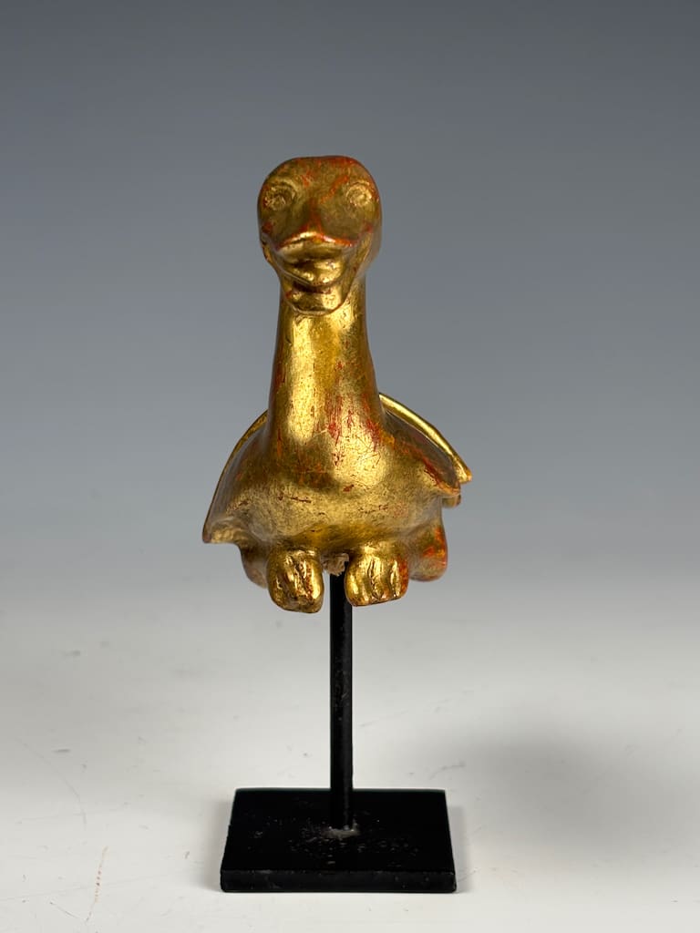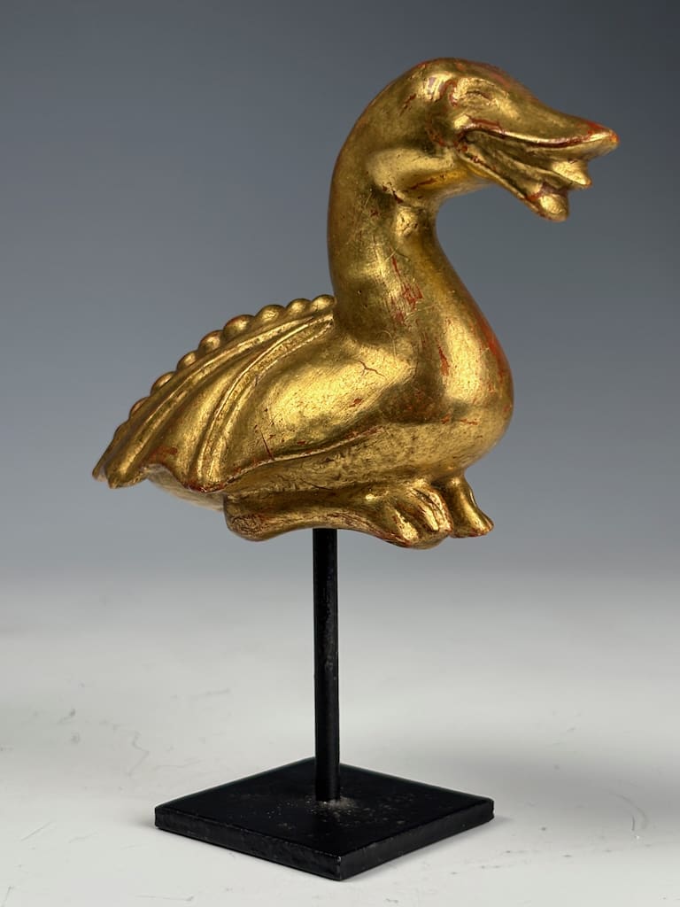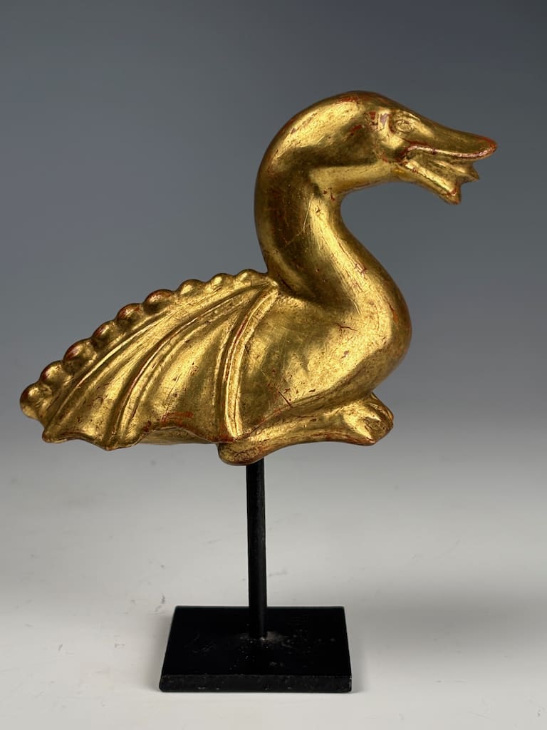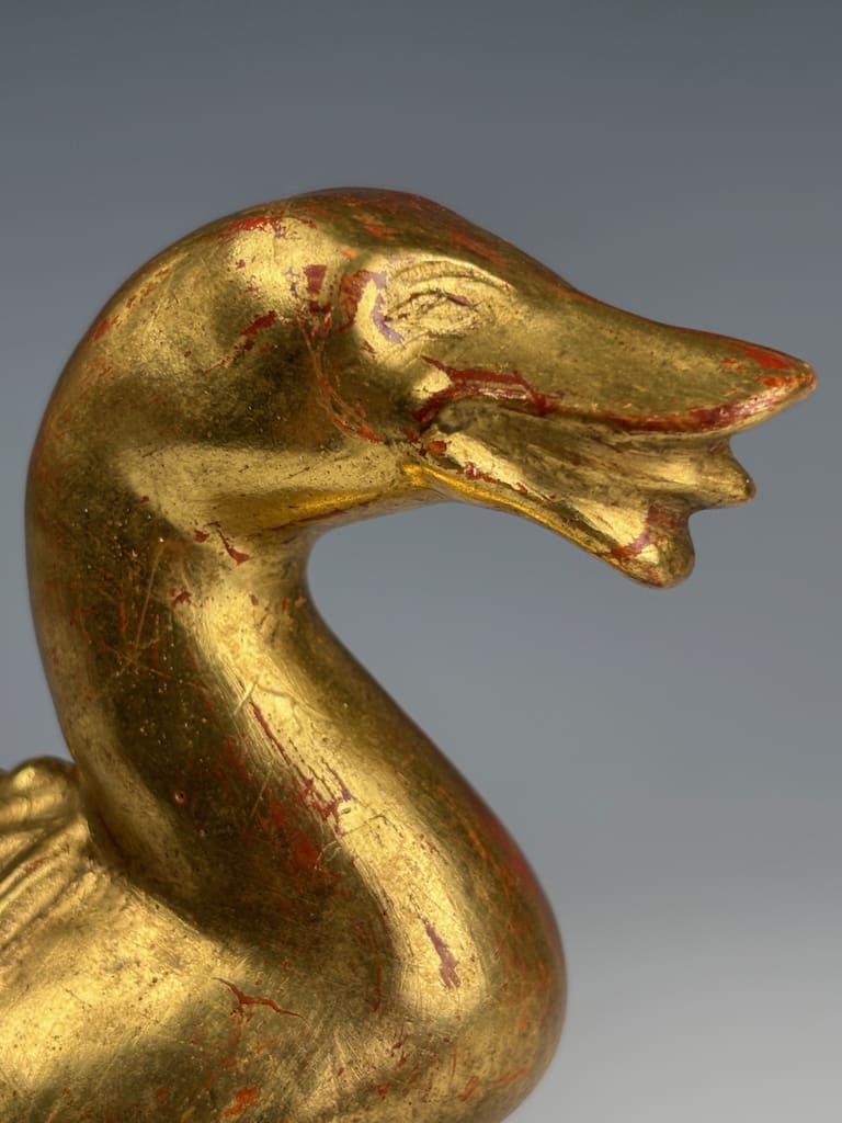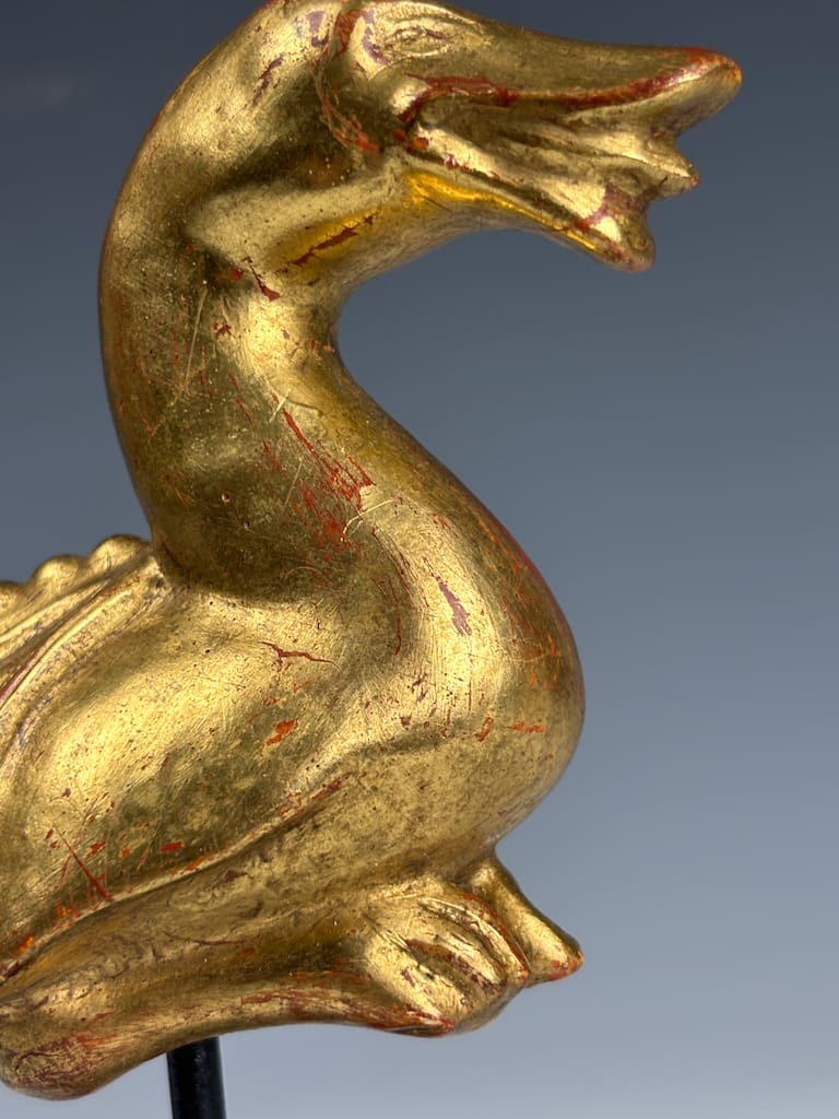 An enchanting antique giltwood sculpture depicting a mythical duck-like creature, exuding a charming blend of folk artistry and imaginative design. Finely hand-carved from wood and finished in rich gold leaf, this whimsical figure showcases exaggerated, stylized features—including a pronounced beak, arched neck, and a textured ridge along its back—suggesting a fantastical or symbolic representation rather than a naturalistic one.