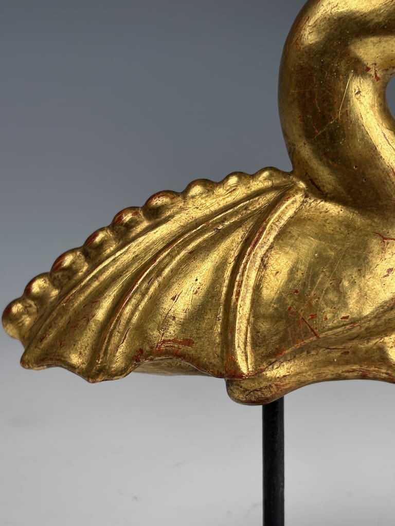 Likely originating from 19th to early 20th century decorative traditions, this piece may have served a ceremonial, ornamental, or architectural function. The worn gilt patina and subtle surface wear lend authenticity and character, emphasizing its age and craftsmanship.