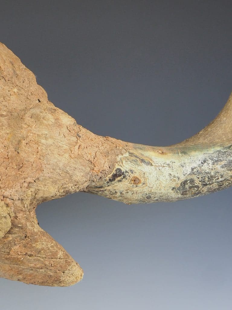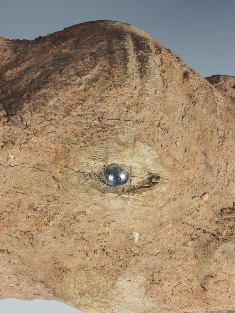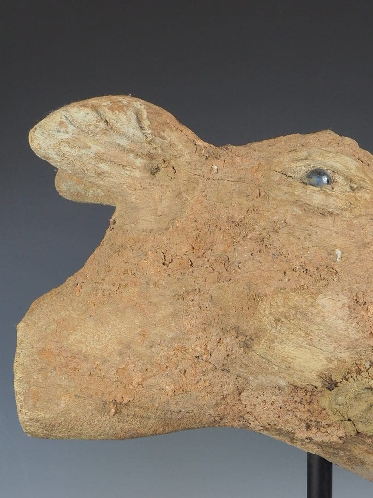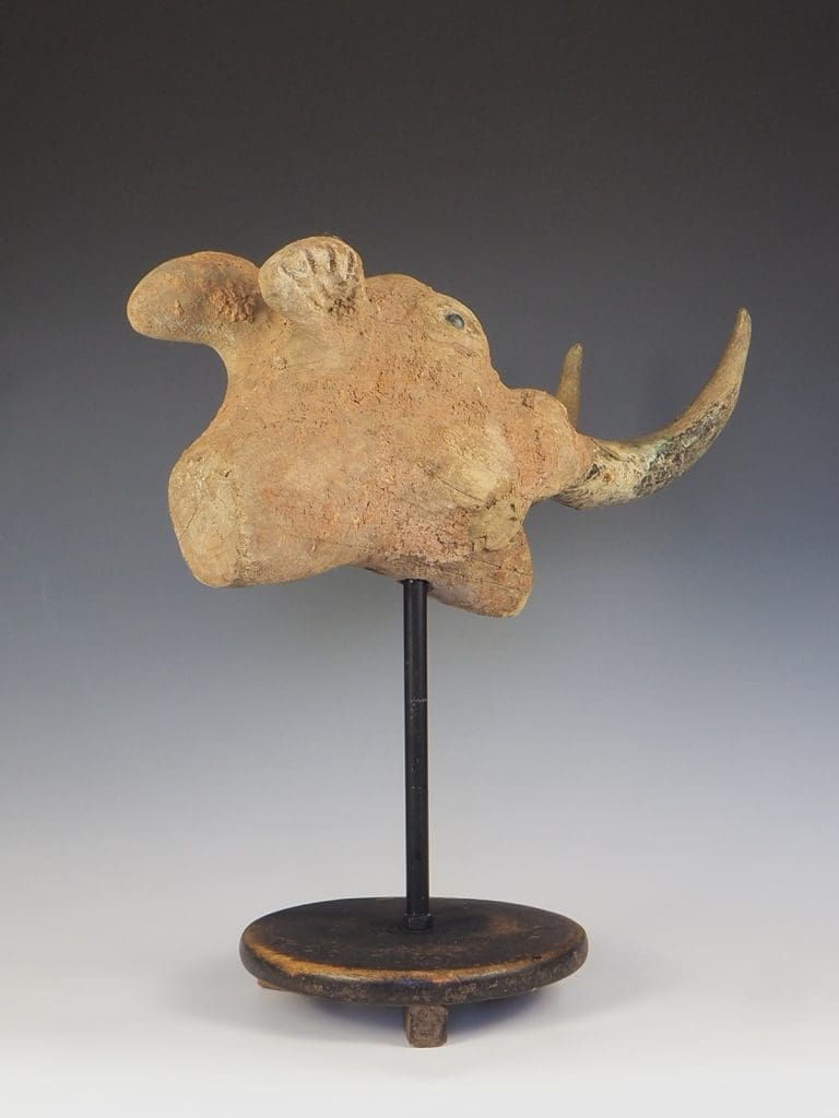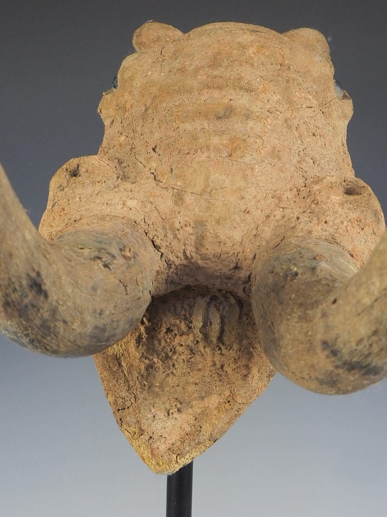 This unique sculpture features a head adorned with raw earth African clay, providing an organic texture that enhances its visual appeal, while the glass eyes add a captivating lifelike quality that draws the viewer in. The striking carved tusks, meticulously detailed, evoke a sense of strength and majesty, making this sculpture a perfect centerpiece for any home or office.