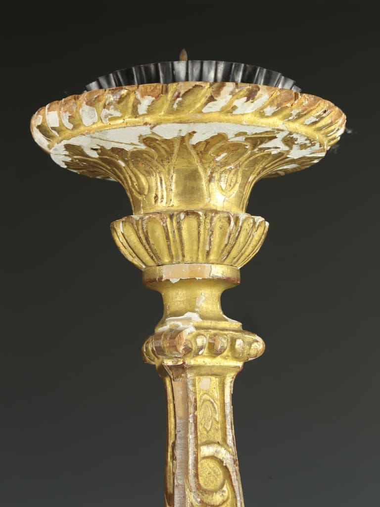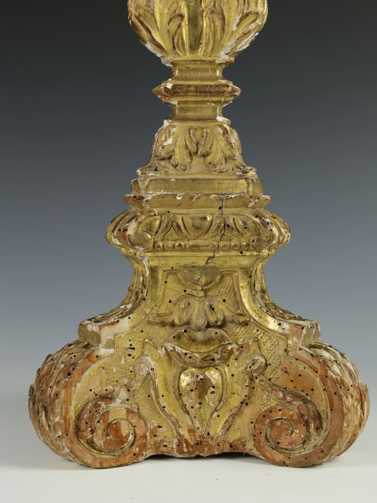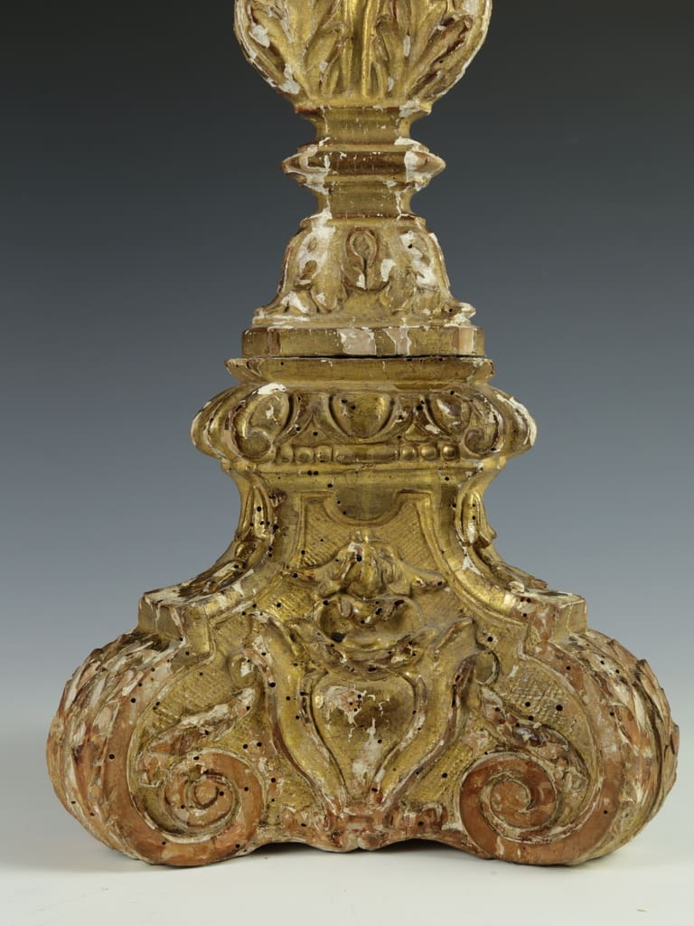 This antique Italian altar candlestick is in good condition, with some loss of gilt and gesso. It shows historic woodworm holes that have been treated, adding to its authentic aged charm.